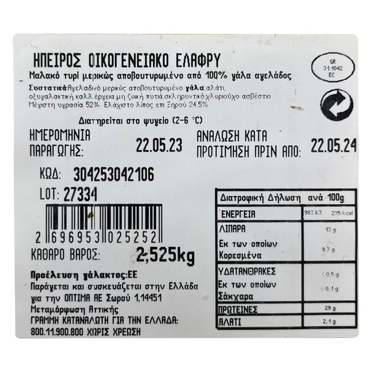 Το αγαπημένο μας ΗΠΕΙΡΟΣ Οικογενειακό, τώρα και σε light εκδοχή για εσάς που προσέχετε την διατροφή σας. Το ΗΠΕΙΡΟΣ Οικογενειακό Ελαφρύ είναι ένα εξαιρετικό τυρί με μόνο 13% λιπαρά, που θα μετατρέψει το τοστ κι οποιαδήποτε άλλη γευστική δημιουργία σε αναπόσπαστο κομμάτι μίας ισορροπημένης διατροφής. Με απαλή, ισορροπημένη γεύση, με βουτυράτες νότες και κρεμώδη υφή, είναι η ιδανική, καθημερινή επιλογή που θα λατρέψει όλη η οικογένεια.