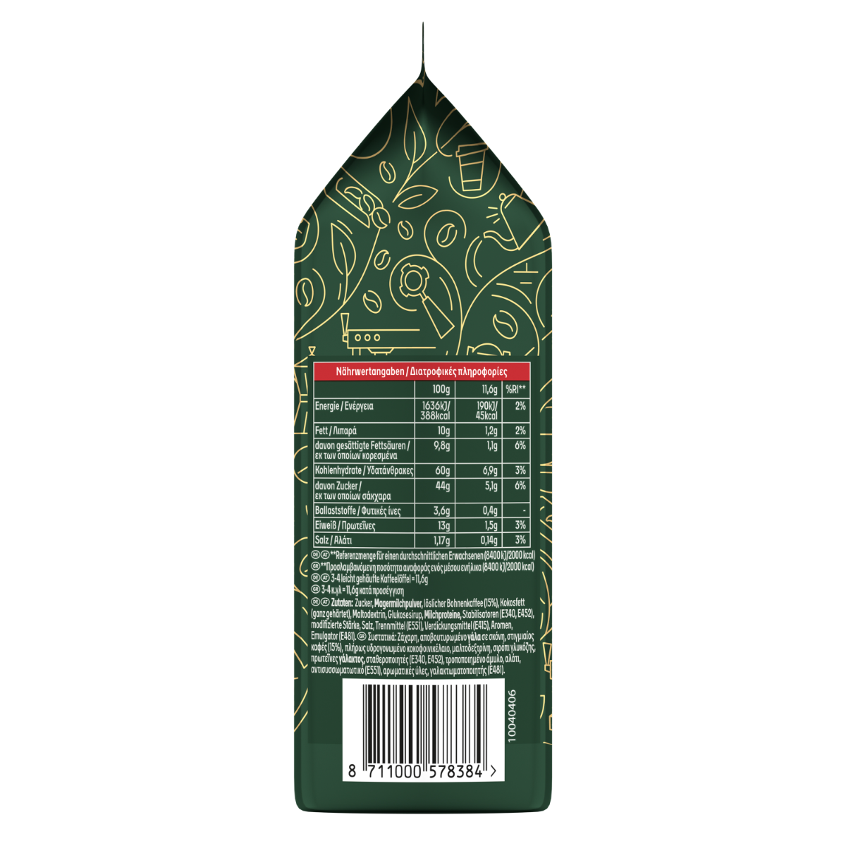 Ζάχαρη, αποβουτυρωμένο ΓΑΛΑ σε σκόνη, στιγμιαίος καφές (15%), πλήρως υδρογονωμένο κοκοφινοικέλαιο, μαλτοδεξτρίνη, σιρόπι γλυκόζης, πρωτεΐνες ΓΑΛΑΚΤΟΣ, τροποποιημένο άμυλο, σταθεροποιητές (Ε340, Ε452), αλάτι, αντισυσσωματοποιητικός παράγοντας (Ε551), αρωματική ύλη, γαλακτωματοποιητής (Ε481).