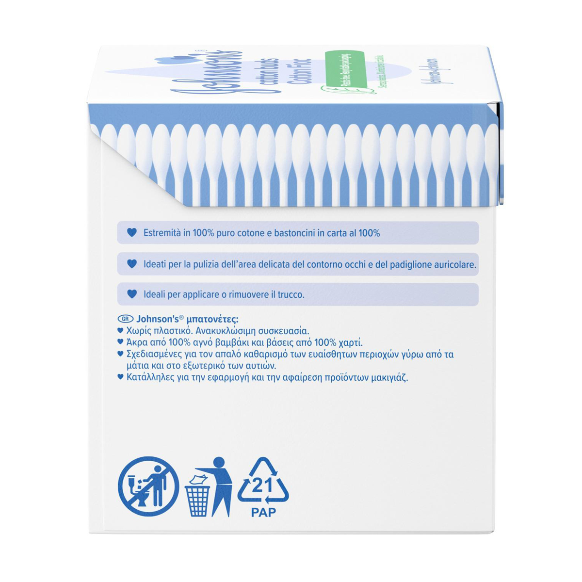 Οι Johnson's® Βaby Cotton Buds έχουν σύνθεση από 100% αγνό βαμβάκι και ειδική σχεδίαση για τον απαλό καθαρισμό των ευαίσθητων περιοχών γύρω από τα μάτια και στο εξωτερικό των αυτιών.