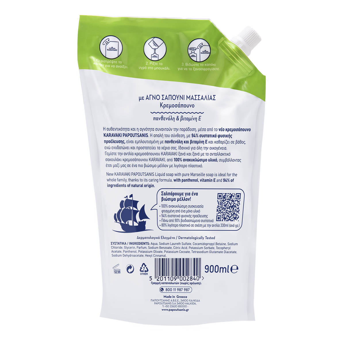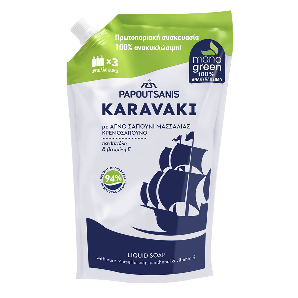 Η αυθεντικότητα και η αγνότητα συναντούν την παράδοση, μέσα από το νέο κρεμοσάπουνο KARAVAKI PAPOUTSANIS. Η απαλή του σύνθεση, με 94% συστατικά φυσικής προέλευσης, είναι εμπλουτισμένη με πανθενόλη και βιταμίνη Ε και καθαρίζει σε βάθος, ενώ ενυδατώνει και προστατεύει τα χέρια σας. Ιδανικό για όλη την οικογένεια. Γεμίστε την αντλία κρεμοσάπουνου KARAVAKI ξανά και ξανά με τα ανταλλακτικά σακουλάκια κρεμοσάπουνου KARAVAKI, από 100% ανακυκλώσιμο υλικό, συμβάλλοντας έτσι μαζί μας σε ένα πιο βιώσιμο μέλλον με λιγότερο πλαστικό.