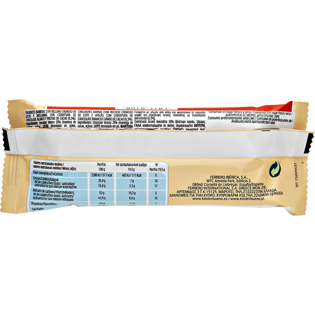 Γκοφρέτα με επικάλυψη λευκής σοκολάτας και γέμιση από γάλα και φουντούκια.