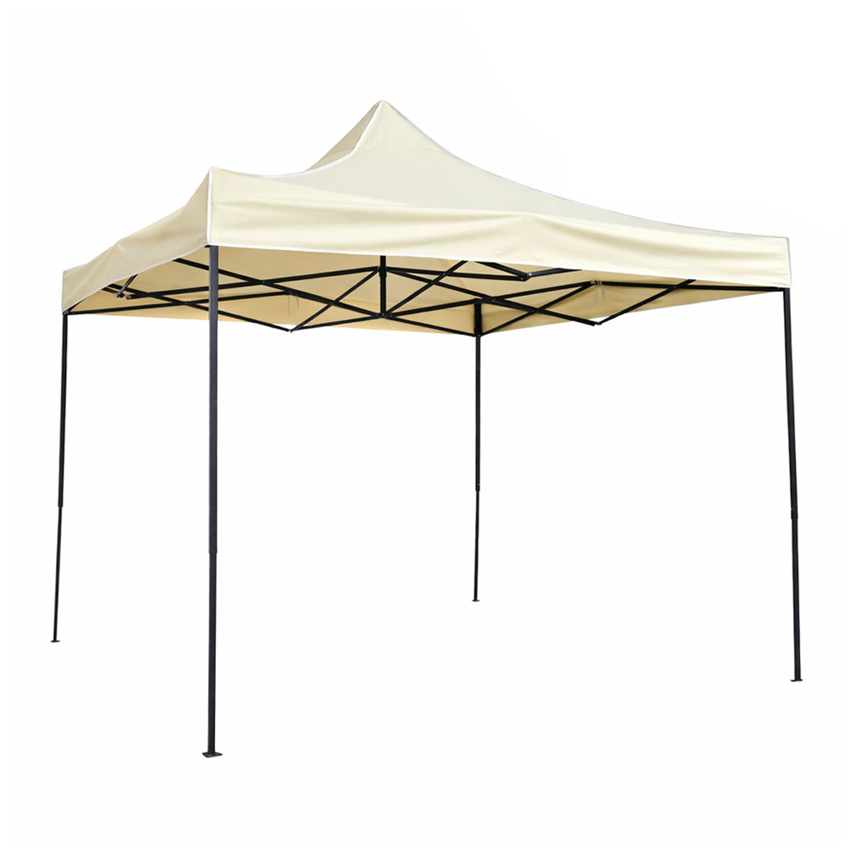 Ενισχυμένο πτυσσόμενο κιόσκι σχεδιασμένο για μεγαλύτερη σταθερότητα στον άνεμο, διαθέτει ανθεκτικό μεταλλικό σκελετό και αδιάβροχο πολυεστερικό ύφασμα 420D για προστασία από τον ήλιο και τις καιρικές συνθήκες. Για επιπλέον αντοχή, διαθέτει 4 συρματόσχοινα από τις γωνίες προς τον κεντρικό πυλώνα, καλυμμένα με PVC, που ενισχύουν τη σταθερότητα της κατασκευής. Το σύστημα στήριξης προσφέρει 3 ρυθμίσεις ύψους (185/193/210εκ.) με κλείδωμα ασφαλείας.