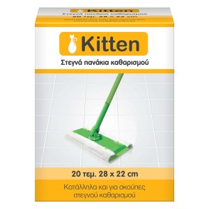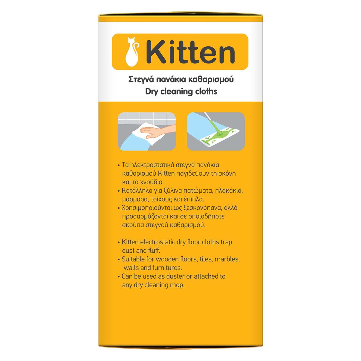 Τα ηλεκτροστατικά στεγνά πατάκια καθαρισμού Kitten παγιδεύουν τη σκόνη και τα χνούδια. Κατάλληλα για ξύλινα πατώματα, πλακάκια, μάρμαρα, τοίχους και έπιπλα. Χρησιμοποιούνται ως ξεσκονόπανα, αλλά προσαρμόζονται και σε οποιαδήποτε σκούπα καθαρισμού.
