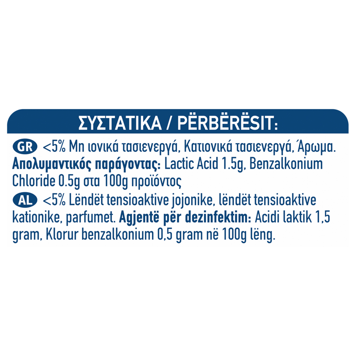 <5% Μη-ιονικά τασιενεργά, Άρωμα. ΑΠΟΛΥΜΑΝΤΙΚΟΣ ΠΑΡΑΓΟΝΤΑΣ: Ανά 100g προϊόντος περιέχονται 0,17g σαλικυλικό οξύ.
