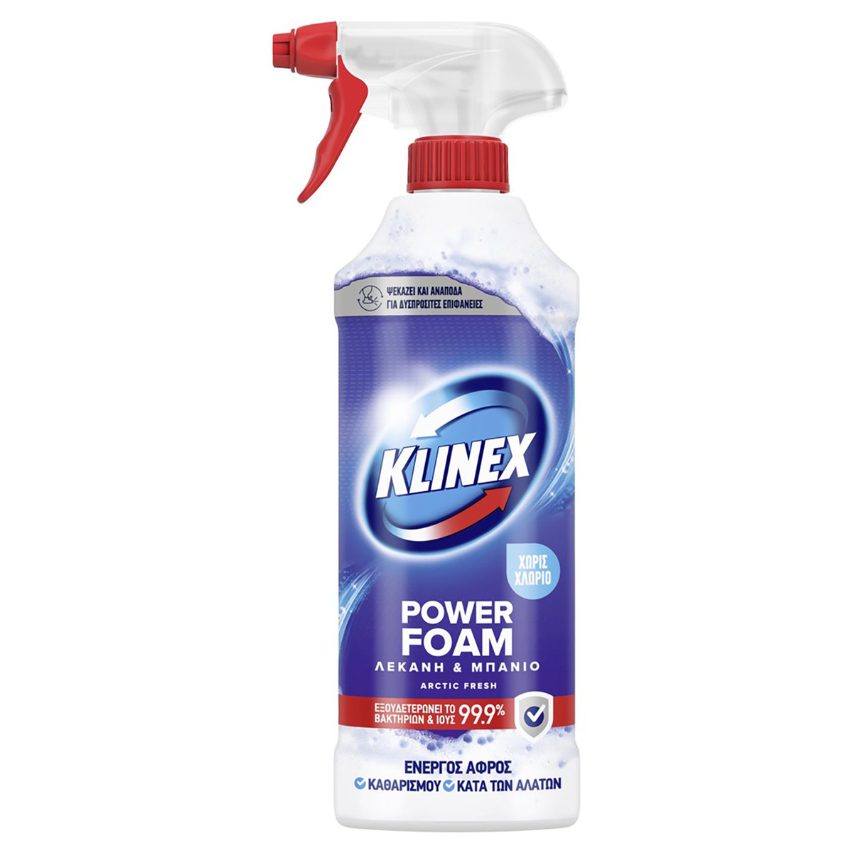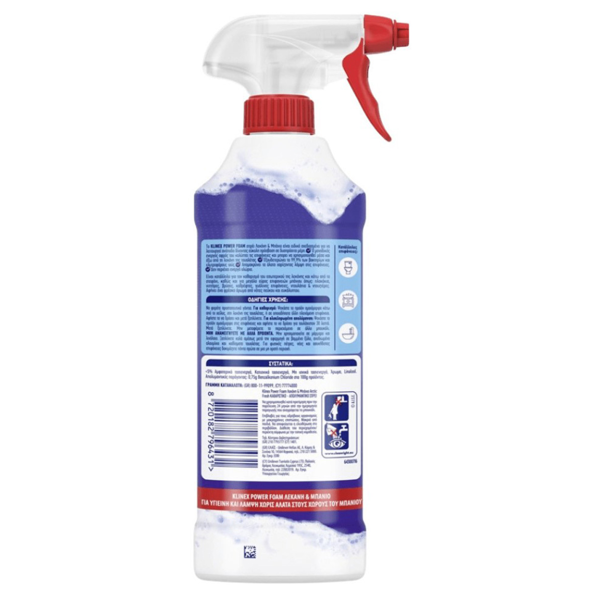Το Klinex Power Foam σπρέι Λεκάνη & Μπάνιο είναι ειδικά σχεδιασμένο για να λειτουργεί ανάποδα δίνοντας εύκολη πρόσβαση σε δυσπρόσιτα μέρη, ο μοναδικός ενεργός αφρός του καλύπτει τις επιφάνειες και μπορει να χρησιμοποιηθεί μέσα και έξω από τη λεκάνη της τουαλέτας, εξουδετερώνει το 99,9% των βακτηρίων και ελυτροφόρους ιούς, απομακρύνει τα άλατα χαρίζοντας λάμψη στις επιφάνειες, δεν περιέχει ενεργό χλώριο. Είναι κατάλληλο για τον καθαρισμό του εσωτερικού της λεκάνης και κάτω από το στεφάνι, καθώς και για μεγάλο εύρος επιφανειών μπάνιου όπως: πλακάκια, νιπτήρες, βρύσες, καθρέφτες, γυάλινες επιφάνειες, ντουλάπια & ντουζιέρες. Αφήνει ένα φρέσκο άρωμα από νότες πεύκου και ευκάλυπτου.