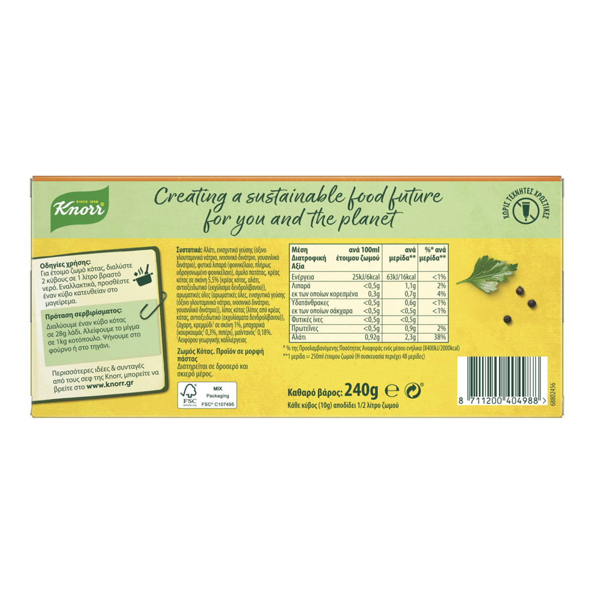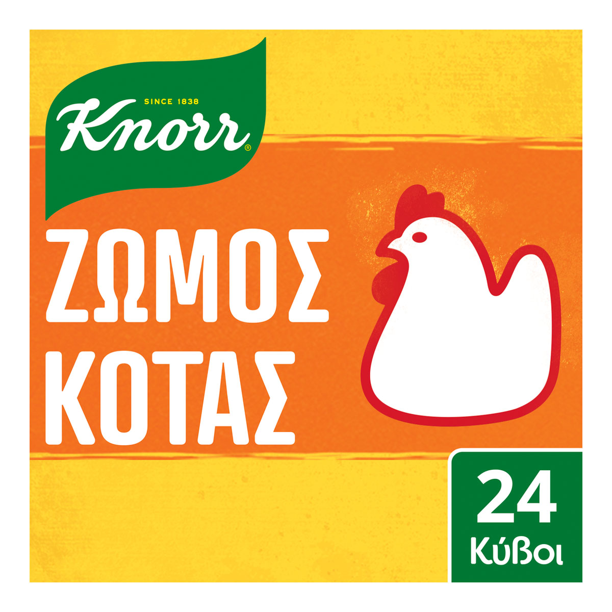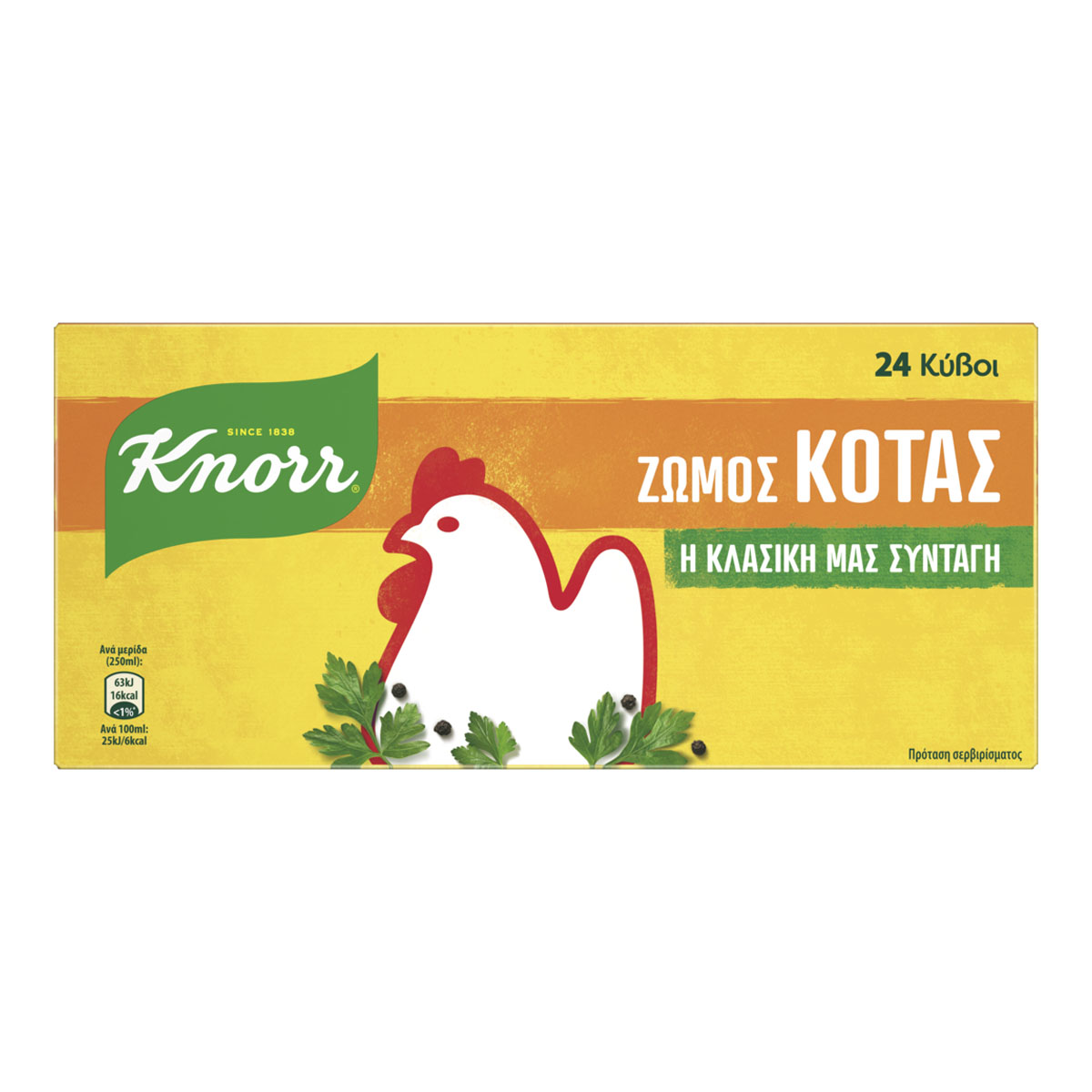 Οι Knorr Κύβοι είναι εμπνευσμένοι από τις ανάγκες της Ελληνικής κουζίνας και συνοδεύουν όλα τα αγαπημένα σας πιάτα. Ο κύβος κότας προσφέρει πλούσια γεύση στο φαγητό σας και αναδεικνύει όλα σας τα πιάτα με κοτόπουλο, τα ψητά, τα μαγειρευτά, και τις σούπες σας. Ο Knorr Κύβος Κότας περιέχει πλούσιο ζωμό κότας, μπαχαρικά και πολλά μυρωδικά για να δώσει στις συνταγές σας υπέροχη γεύση.