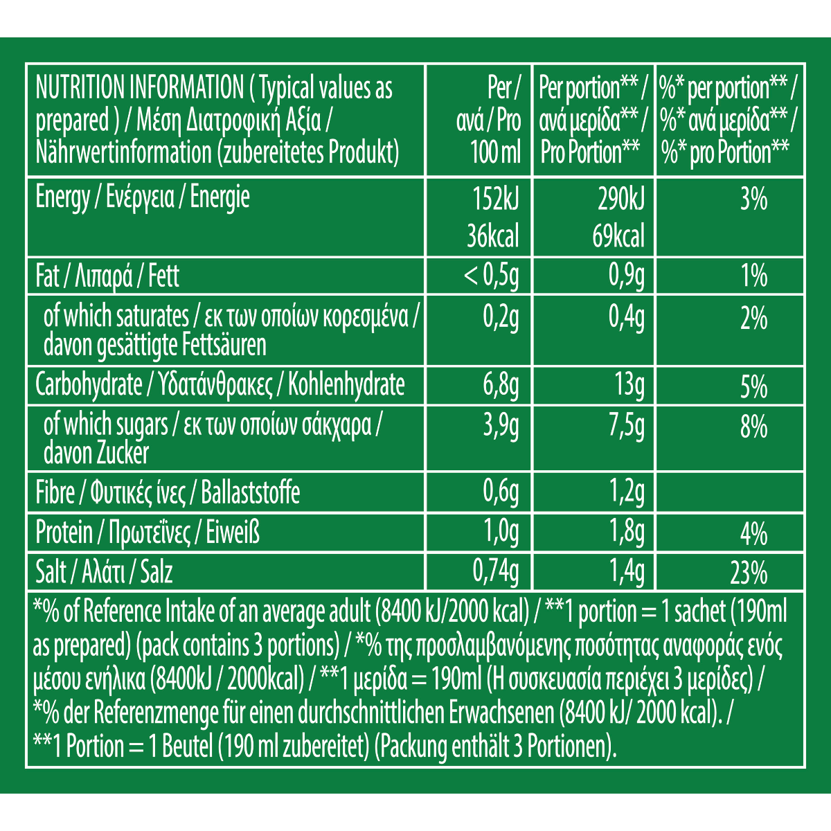 | Ενέργεια (ανά 100g) | 36 kcal |