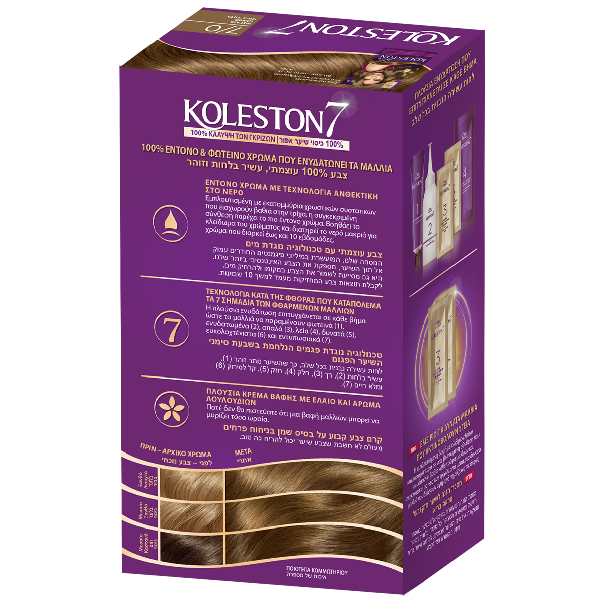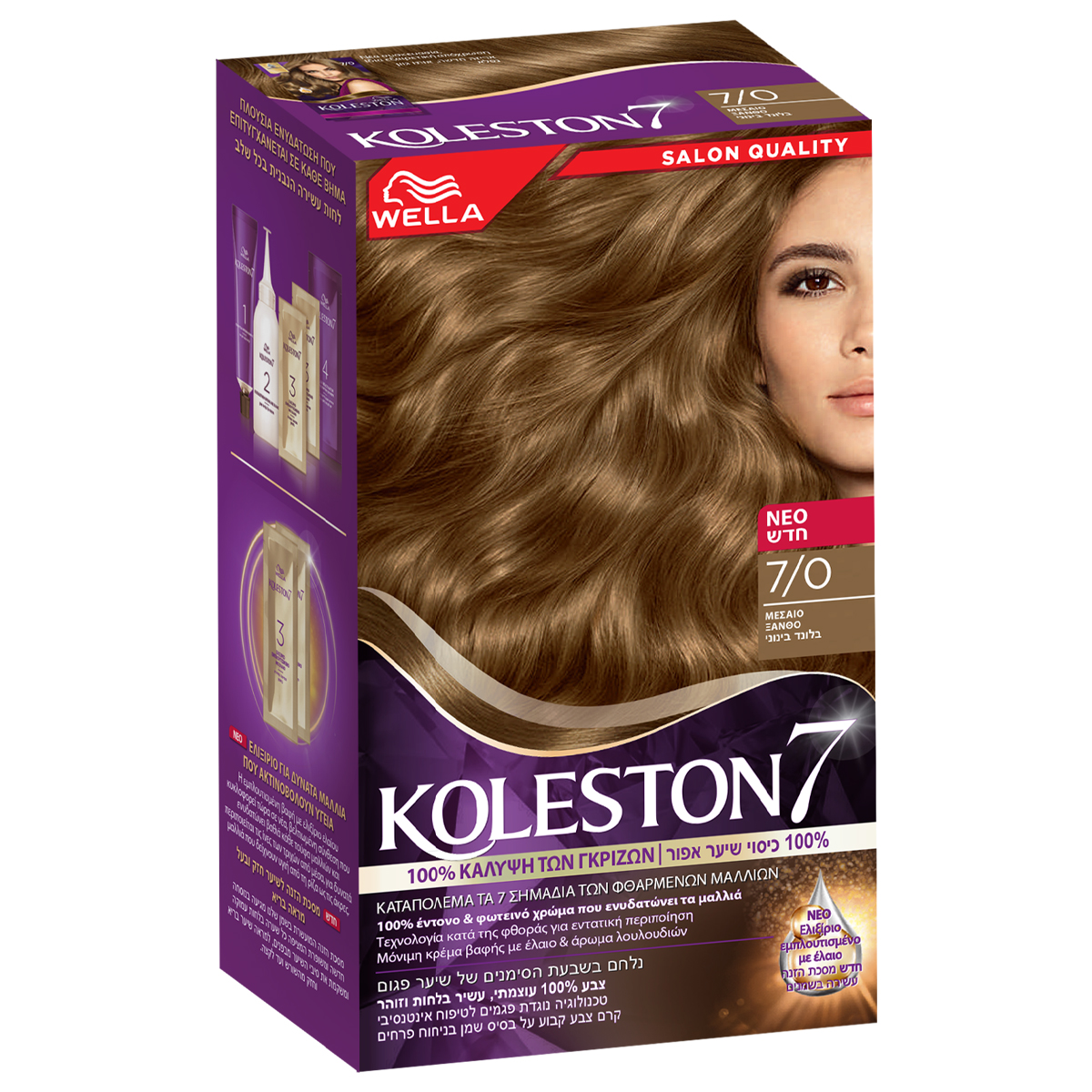 Νέα KOLESTON Κρέμα βαφή 7/0 - Μεσαίο Ξανθό για 100% κάλυψη των γκρίζων, με ελιξίριο εμπλουτισμένο με έλαιο και βελτιωμένη σύνθεση για πλούσια ενυδάτωση που επιτυγχάνεται σε κάθε βήμα. Με τεχνολογία ανθεκτική στο νερό, εμπλουτισμένη με εκατομμύρια χρωστικών συστατικών που εισχωρούν βαθιά στην τρίχα, η συγκεκριμένη σύνθεση παρέχει το πιο έντονο χρώμα. Βοηθάει το κλείδωμα του χρώματος και διατηρεί το νερό μακριά, για χρώμα που διαρκεί έως και 10 εβδομάδες. Καταπολεμά τα 7 σημάδια των φθαρμένων μαλλιών, ώστε τα μαλλιά να παραμένουν φωτεινά, ενυδατωμένα, απαλά, λεία, δυνατά, ευκολοχτένιστα και εντυπωσιακά. Με υπέροχο άρωμα λουλουδιών.