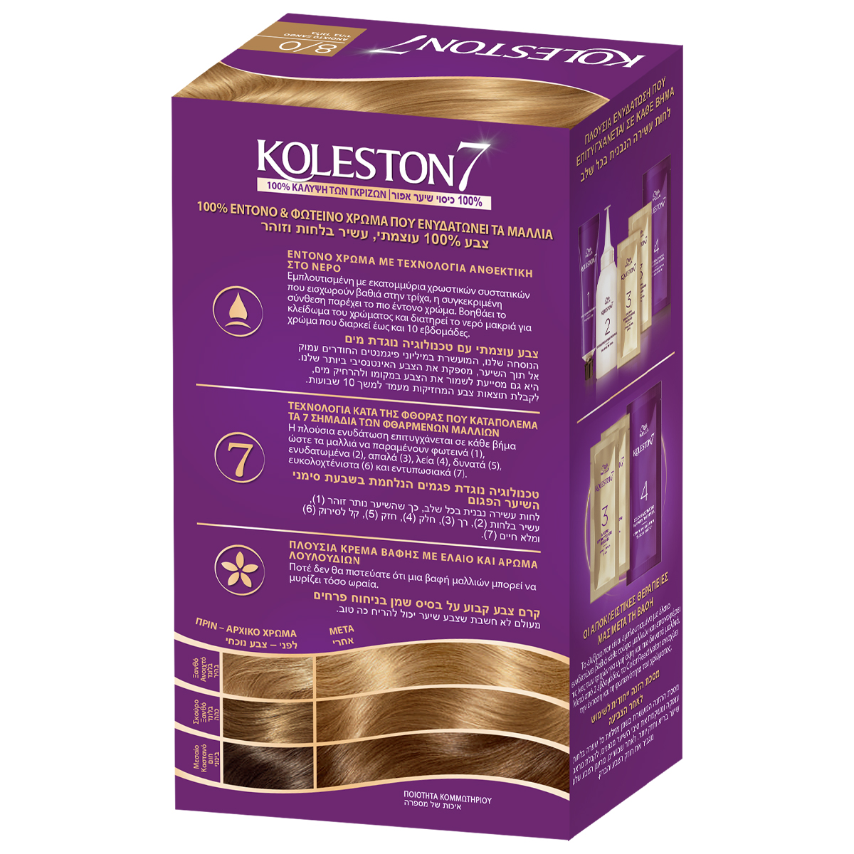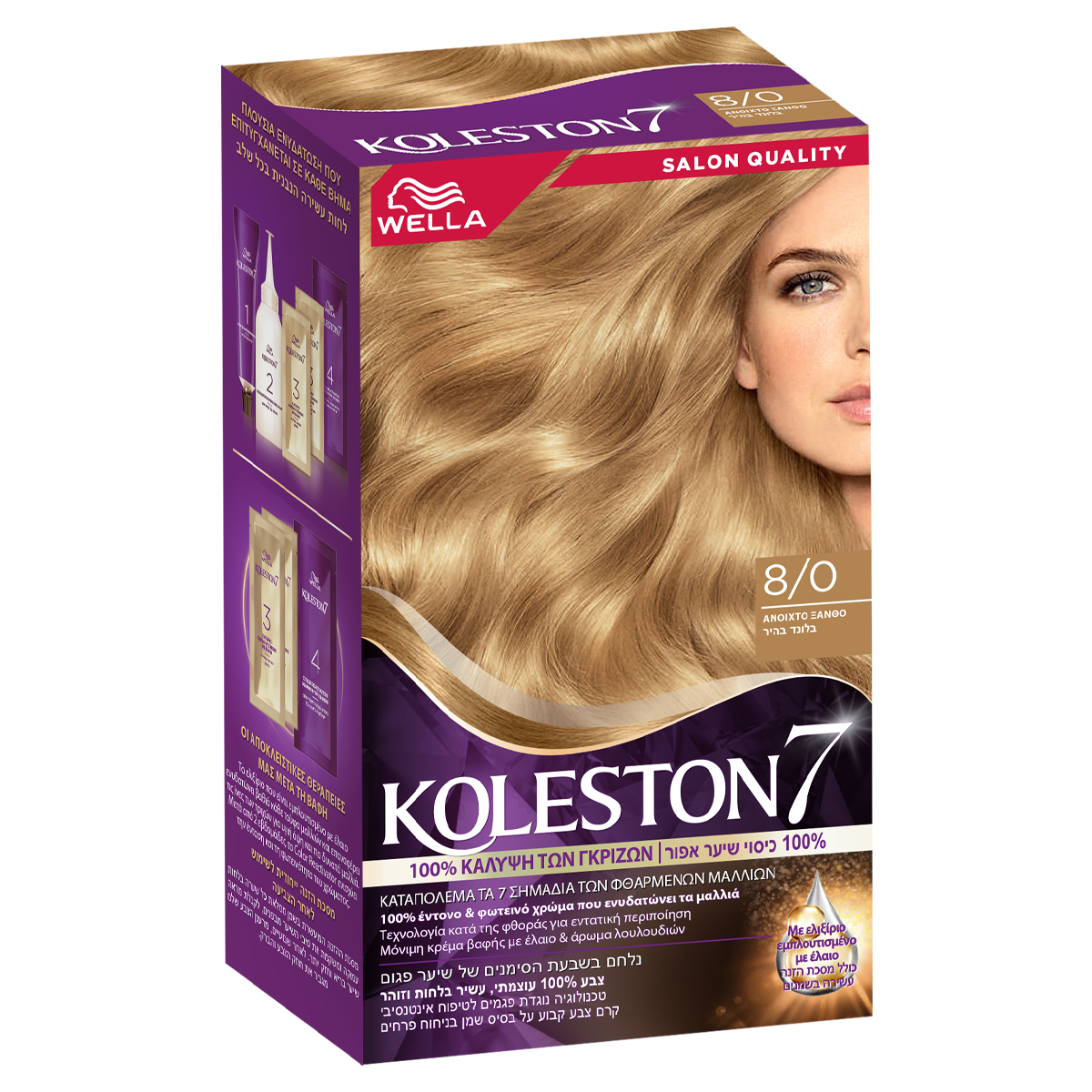 Νέα KOLESTON Κρέμα βαφή 8/0 - Ανοιχτό Ξανθό για 100% κάλυψη των γκρίζων, με ελιξίριο εμπλουτισμένο με έλαιο και βελτιωμένη σύνθεση για πλούσια ενυδάτωση που επιτυγχάνεται σε κάθε βήμα. Με τεχνολογία ανθεκτική στο νερό, εμπλουτισμένη με εκατομμύρια χρωστικών συστατικών που εισχωρούν βαθιά στην τρίχα, η συγκεκριμένη σύνθεση παρέχει το πιο έντονο χρώμα. Βοηθάει το κλείδωμα του χρώματος και διατηρεί το νερό μακριά, για χρώμα που διαρκεί έως και 10 εβδομάδες. Καταπολεμά τα 7 σημάδια των φθαρμένων μαλλιών, ώστε τα μαλλιά να παραμένουν φωτεινά, ενυδατωμένα, απαλά, λεία, δυνατά, ευκολοχτένιστα και εντυπωσιακά. Με υπέροχο άρωμα λουλουδιών.