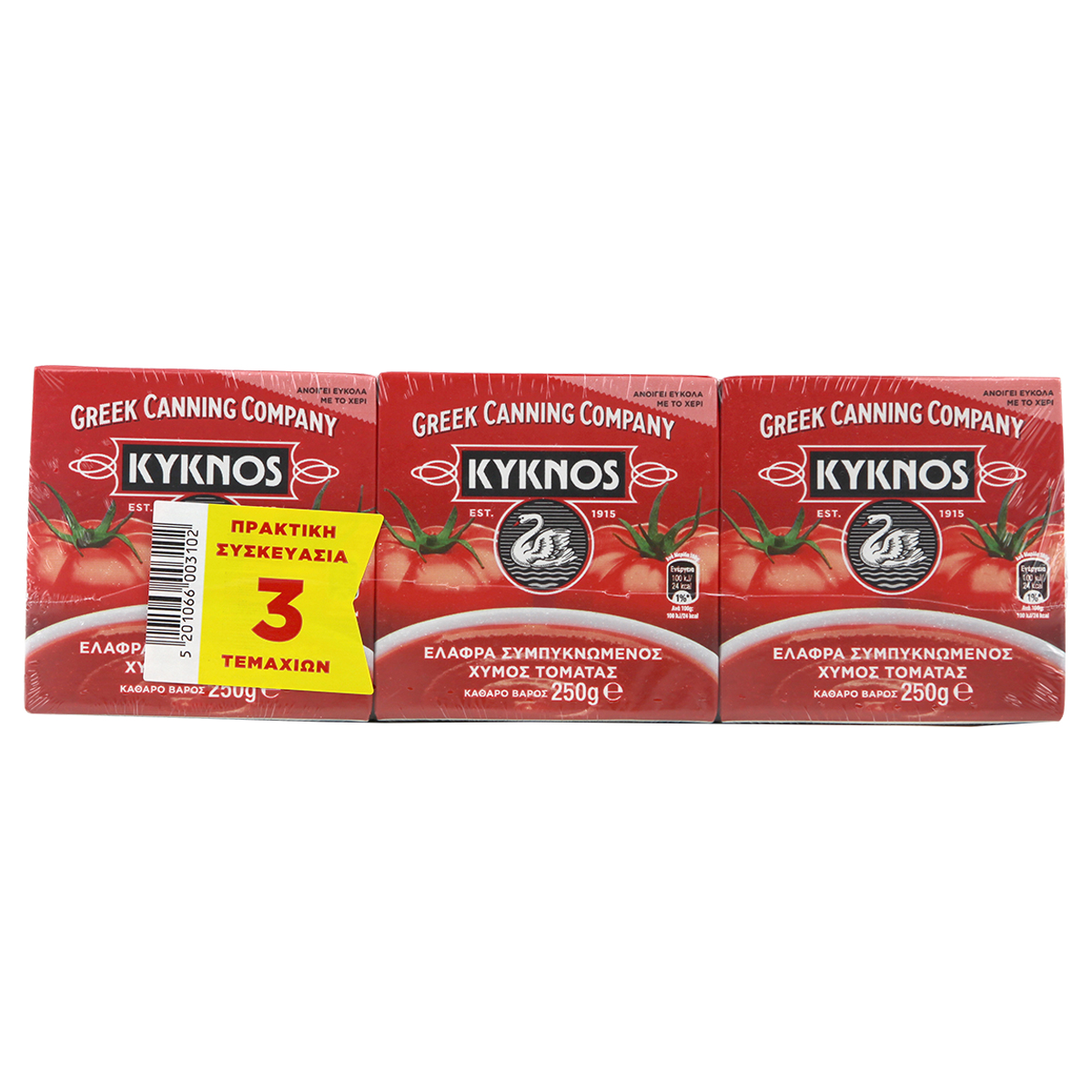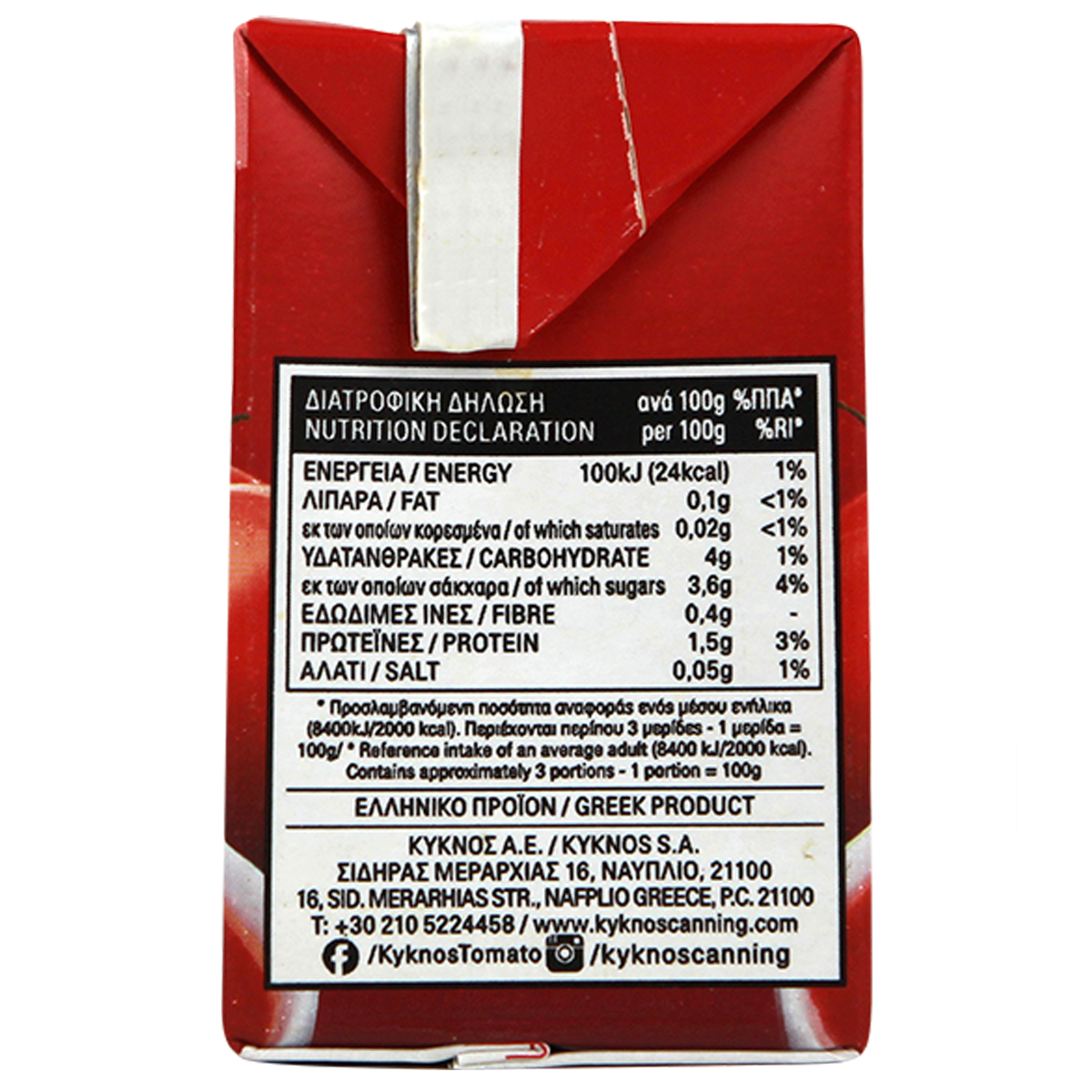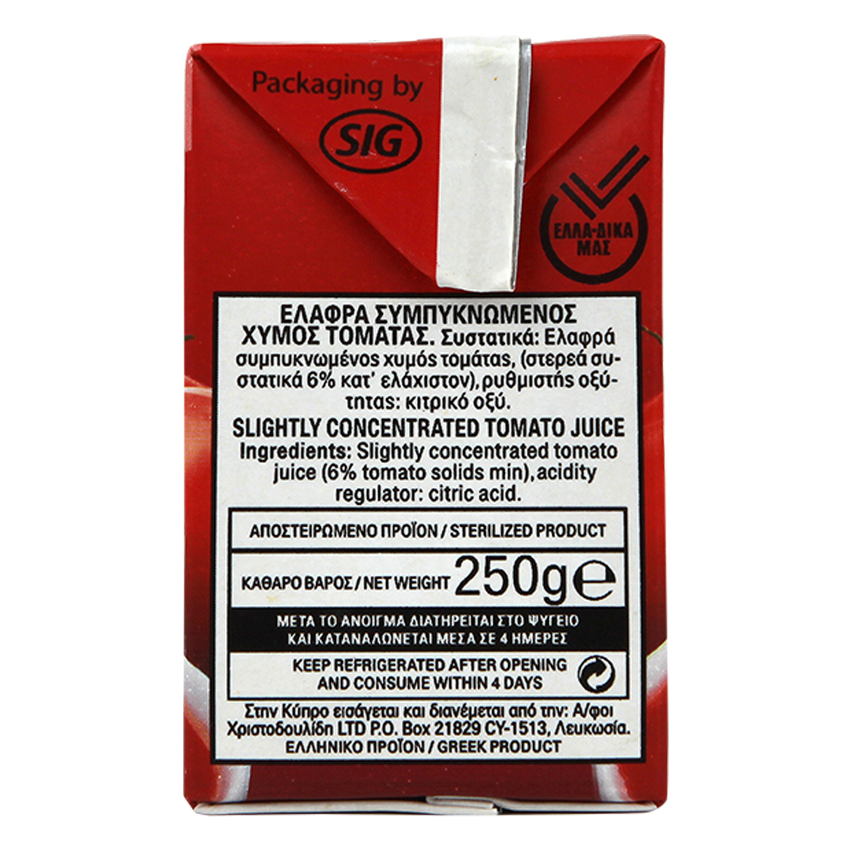 Οι πλούσιες σάλτσες τομάτας ποτέ δεν είχαν καλύτερο σύμμαχο στο φαγητός σας, με άρωμα και γεύση Ελληνικής Τομάτας. Μπορεί να χρησιμοποιηθεί σε όλα τα φαγητά με βάση την τομάτα. Έχει απαλή υφή, ιδανική για σπιτική σάλτσα ζυμαρικών/ πίτσας, μακαρονάδες, λαδερά, όσπρια και για όλα τα κοκκινιστά. Σε χάρτινη πρακτική πολυσυσκευασία 3x250g, με εύκολο άνοιγμα. Αποτελεί πήγη λυκοπενίου, χωρίς συντηρητικά, χωρίς γλουτένη και ιδανική για vegan.