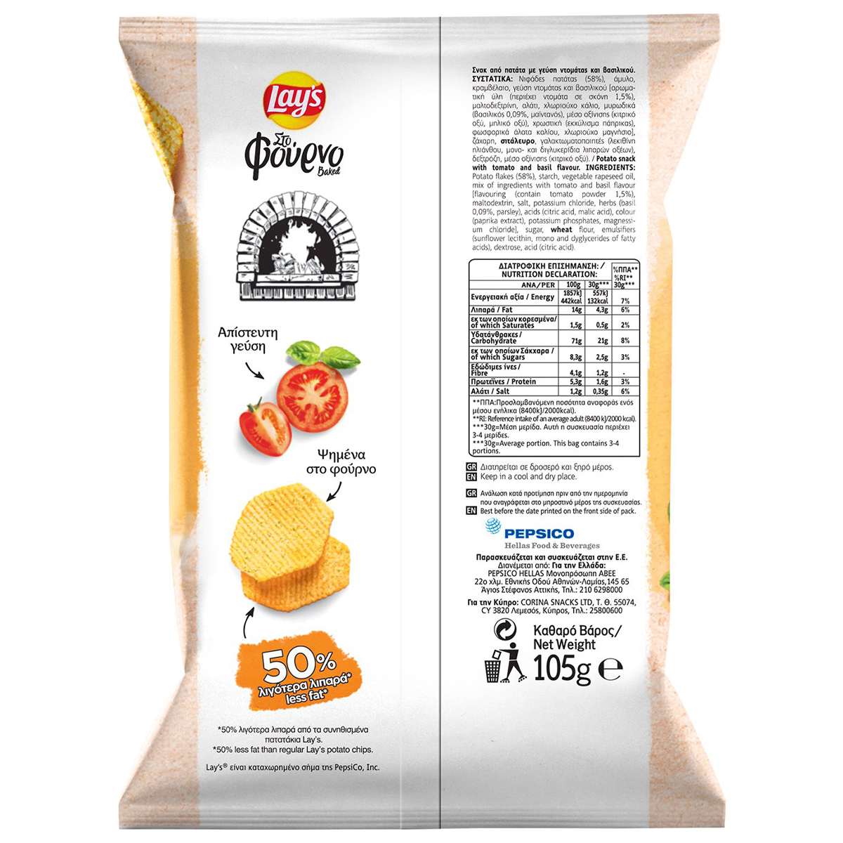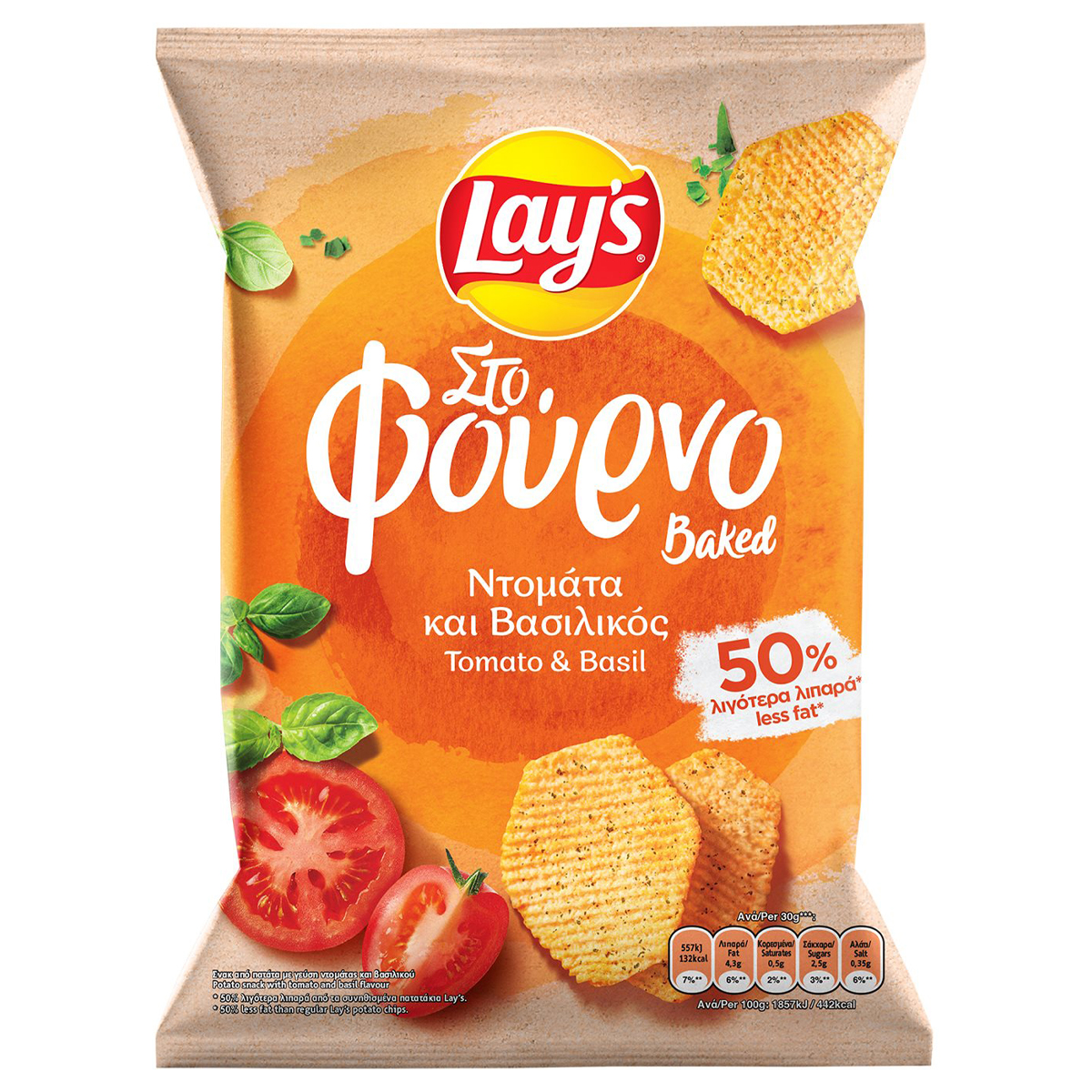 Σνακ από πατάτα ψημένα στον φούρνο, με 50% λιγότερα λιπαρά από τα συνηθισμένα πατατάκια Lay's και γεύση ντομάτας και βασιλικού.