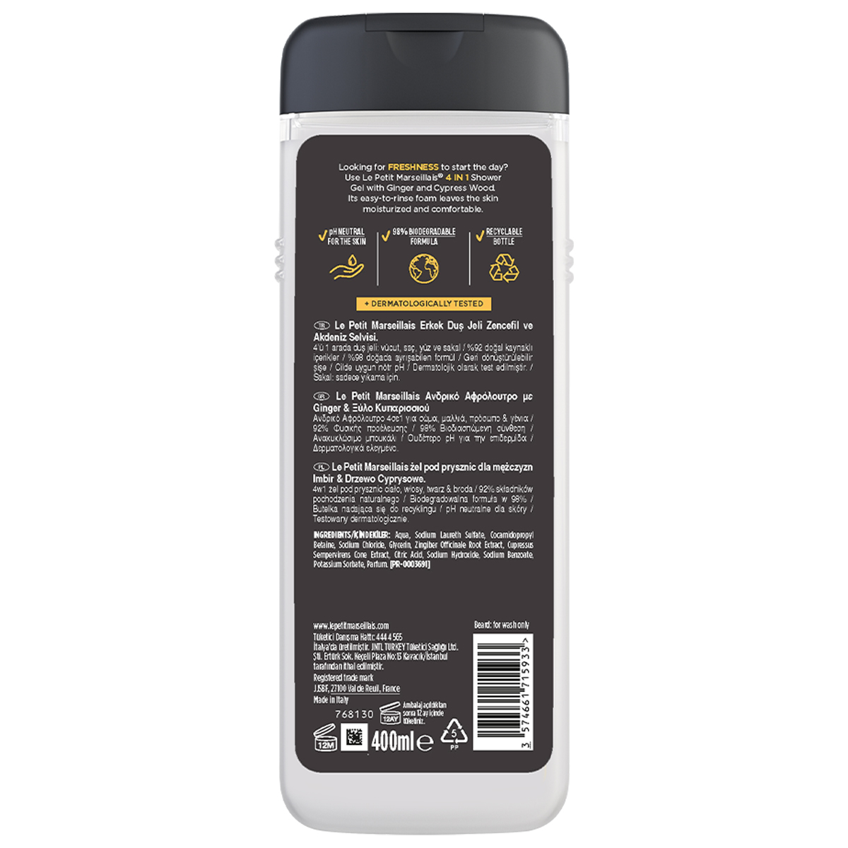 Le Petit Marseillais Ανδρικό Αφρόλουτρο με Ginger και Ξύλο Κυπαρισσιού. Μια σύνθεση 3 σε 1 για άνδρες: Καθαρίζει απαλά το σώμα, το πρόσωπο και τα μαλλιά σας, Αφήνει την επιδερμίδα ενυδατωμένη και άνετη, και είναι κατάλληλο για όλους τους τύπους μαλλιών, Είναι εύκολο στο ξέπλυμα ενώ ο αφρός απελευθερώνει ένα ξυλώδες και πικάντικο άρωμα. Γεννημένο στην Προβηγκία, το Le Petit Marseillais έχει επιλέξει ηλιόλουστα συστατικά για τα αφρόλουτρα του, τα οποία είναι άρρηκτα συνδεδεμένα με τη φύση. Οι ρίζες ginger εκχυλίζονται προσεκτικά για να διατηρηθούν όλες οι ιδιότητές τους. Το κυπαρίσσι είναι ένα ψηλό κωνοφόρο δέντρο τυπικό των μεσογειακών δασών. Η συγκομιδή του ξύλου του γίνεται την άνοιξη. Ουδέτερο pH για την επιδερμίδα. Δερματολογικά ελεγμένο. Τα συστατικά της βάσης καθαρισμού είναι εύκολα βιοδιασπώμενα. Εμπλουτισμένο με ενυδατικό παράγοντα φυτικής προέλευσης.