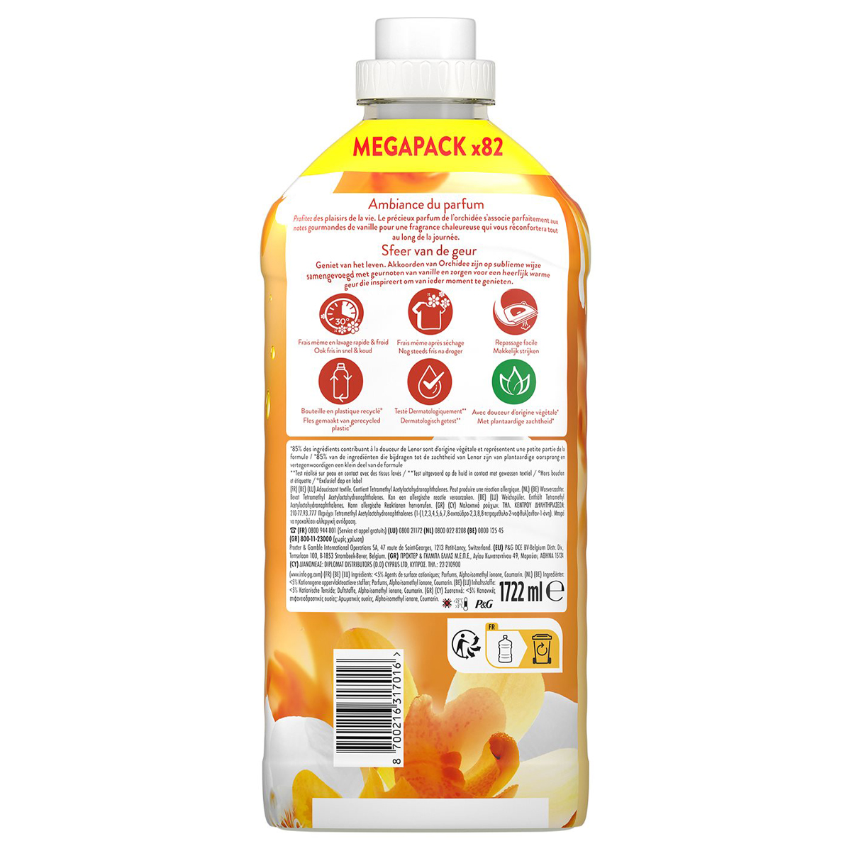 Το μαλακτικό ρούχων Lenor Orchid & Vanilla προσφέρει 24ωρη φρεσκάδα και το άρωμα με νότες από αιθέρια έλαια. Οι συνθέσεις ορχιδέας αναμιγνύονται αριστοτεχνικά με γλυκιές νότες βανίλιας και δημιουργούν έναν ζεστό αρωματικό χαρακτήρα. Δερματολογικά ελεγμένο μαλακτικό ρούχων, με δοκιμή σε επιδερμίδα που ήρθε σε επαφή με πλυμένα υφάσματα.