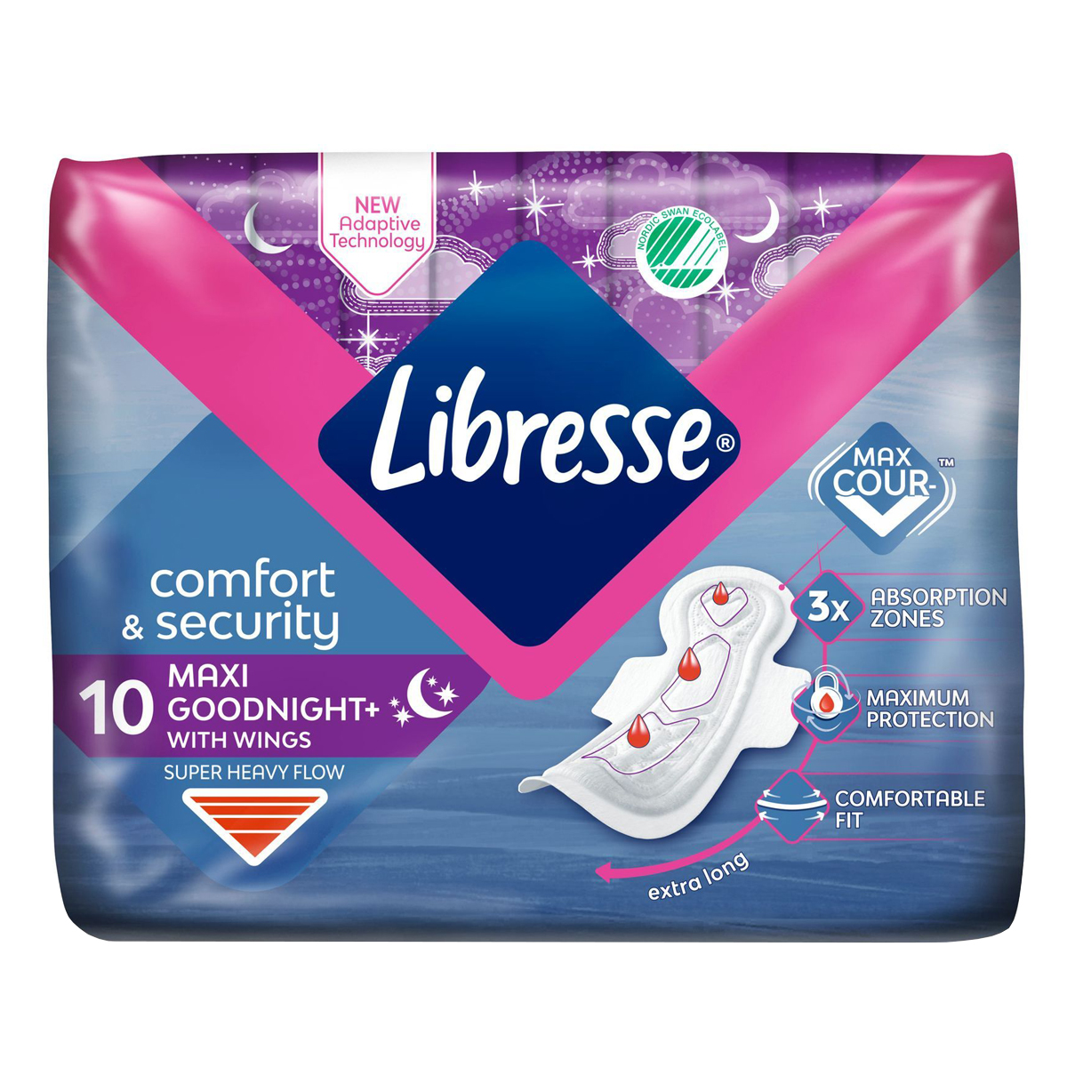 Οι σερβιέτες Comfort & Security Maxi Goodnight νύχτας με τη νέα τεχνολογία Max Cour -V™ για τέλεια εφαρμογή, διαθέτοντας 3 ζώνες απορρόφησης, παρέχουν τη μέγιστη προστασία κατά τη διάρκεια πολύ αυξημένης ροής.