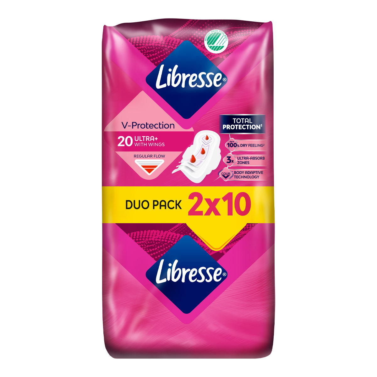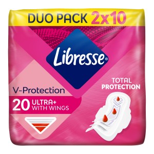 Τίποτα δεν πρέπει να μπαίνει ανάμεσα σε σένα και τη θηλυκότητά σου, ιδίως η περίοδος. Οι σερβιέτες Libresse V-protection Ultra+ Regular με φτερά και τη νέα τεχνολογία Cour-V™ για τέλεια εφαρμογή σου προσφέρουν την προστασία που χρειάζεσαι και αγκαλιάζουν τέλεια το σώμα σου. Η γρήγορη απορρόφηση και οι 3 έξυπνες απορροφητικές ζώνες αυτών των απαλών σερβιετών με φτερά χαρίζουν αίσθηση φρεσκάδας και προστατεύουν την ευαίσθητη περιοχή σου, όλη μέρα. Επειδή εμείς στη Libresse θέλουμε να κινείσαι ελεύθερα.