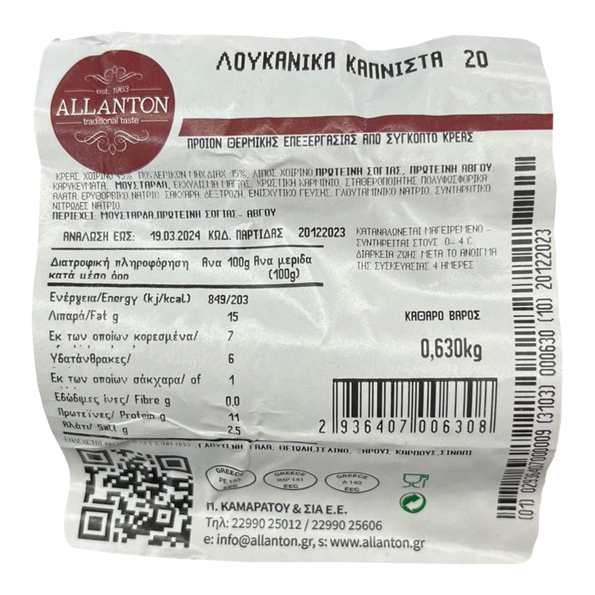 Κρέας: Χοιρινό 45%, κρεάς πουλερικών μηχανικά διαχωρισμένο 45%, πρωτεϊνη ΣΟΓΙΑΣ, πρωτεϊνη ΑΒΓΟΥ, καρυκεύματα, ΜΟΥΣΤΑΡΔΑ, εκχύλισμα μαγιάς, χρωστική καρμίνιο, σταθεροποιητής: πολυφοσφορικά άλατα, ερυθορβικό νάτριο, σάκχαρα, δεξτρόζη, ενισχυικό γεύσης: γλουταμινικό νάτριο, συντηρητικό: νιτρώδες νάτριο.