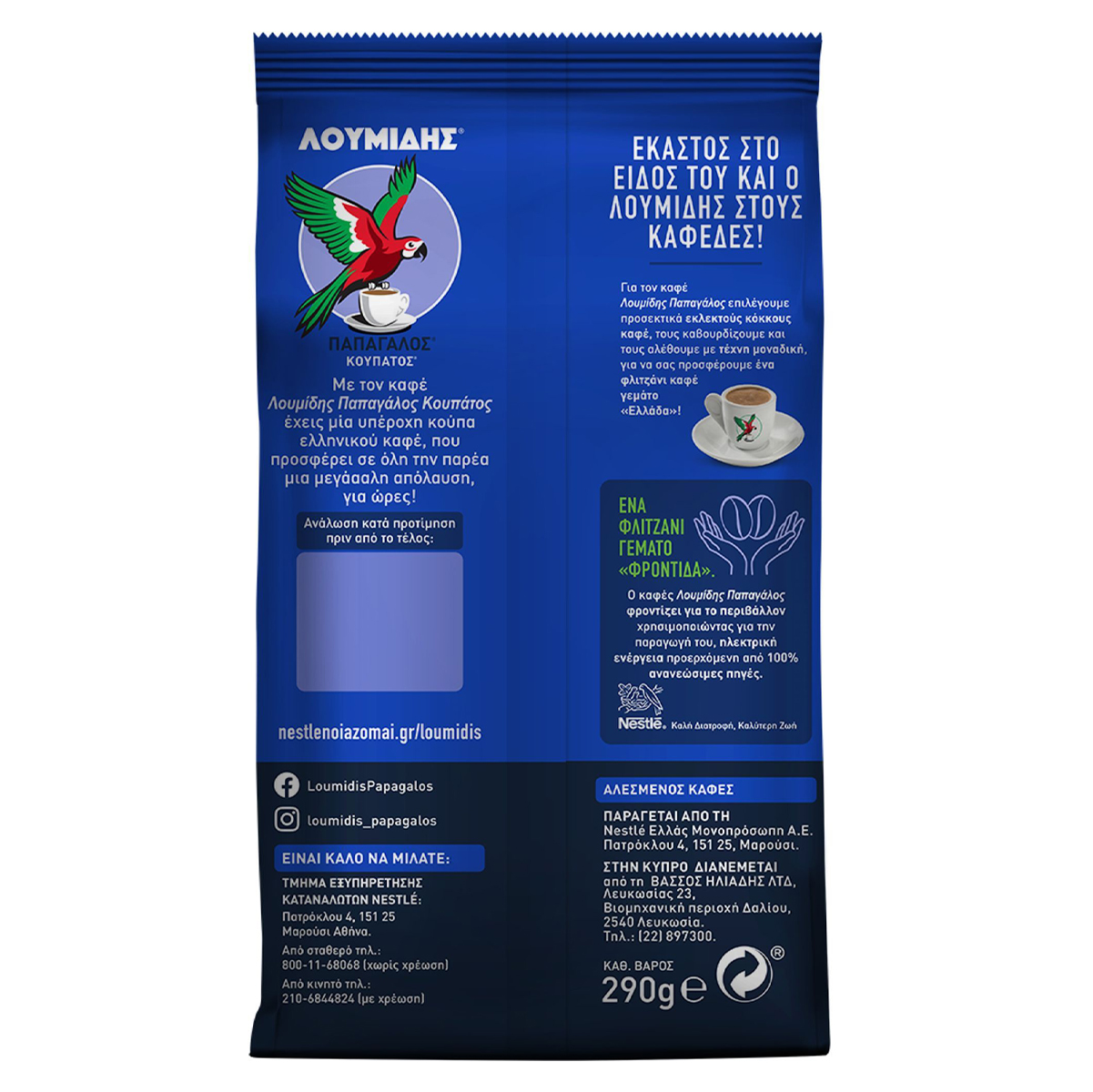 Με τον καφέ ΛΟΥΜΙΔΗΣ® ΠΑΠΑΓΑΛΟΣ® Κουπάτος έχεις μια υπέροχη κούπα ελληνικού καφέ, που προσφέρει σε όλη την παρέα μια μεγάααλη απόλαυση, για ώρες! Ο καφές Λουμίδης Παπαγάλος φροντίζει για το περιβάλλον χρησιμοποιώντας για την παραγωγή του, ηλεκτρική ενέργεια προερχόμενη απο 100% ανανεώσιμες πηγές. Αλεσμένος καφές. 100% φυσικός καφές.
