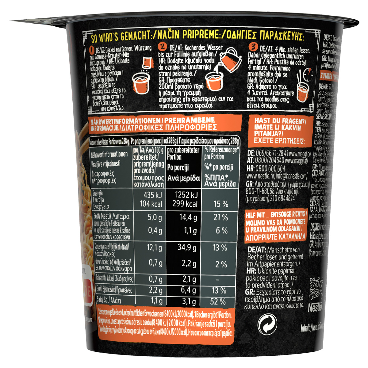 Στιγμιαίο προμαγειρεμένο γεύμα με ζυμαρικά noodles με γεύση πάπια, με 22% ηλιέλαιο. Απολαύστε τα MAGGI MAGIC ASIA NOODLES Cup με γεύση πάπια,το ιδανικό σνακ για όλες τις ώρες! Ένα πεντανόστιμο και χορταστικό γεύμα, το οποίο αποτελείται από ζυμαρικά noodles και μίγμα αποξηραμένων μπαχαρικών. Πανεύκολο και γρήγορο σνακ στην προετοιμασία του με πολύ απλές οδηγίες παρασκευής.