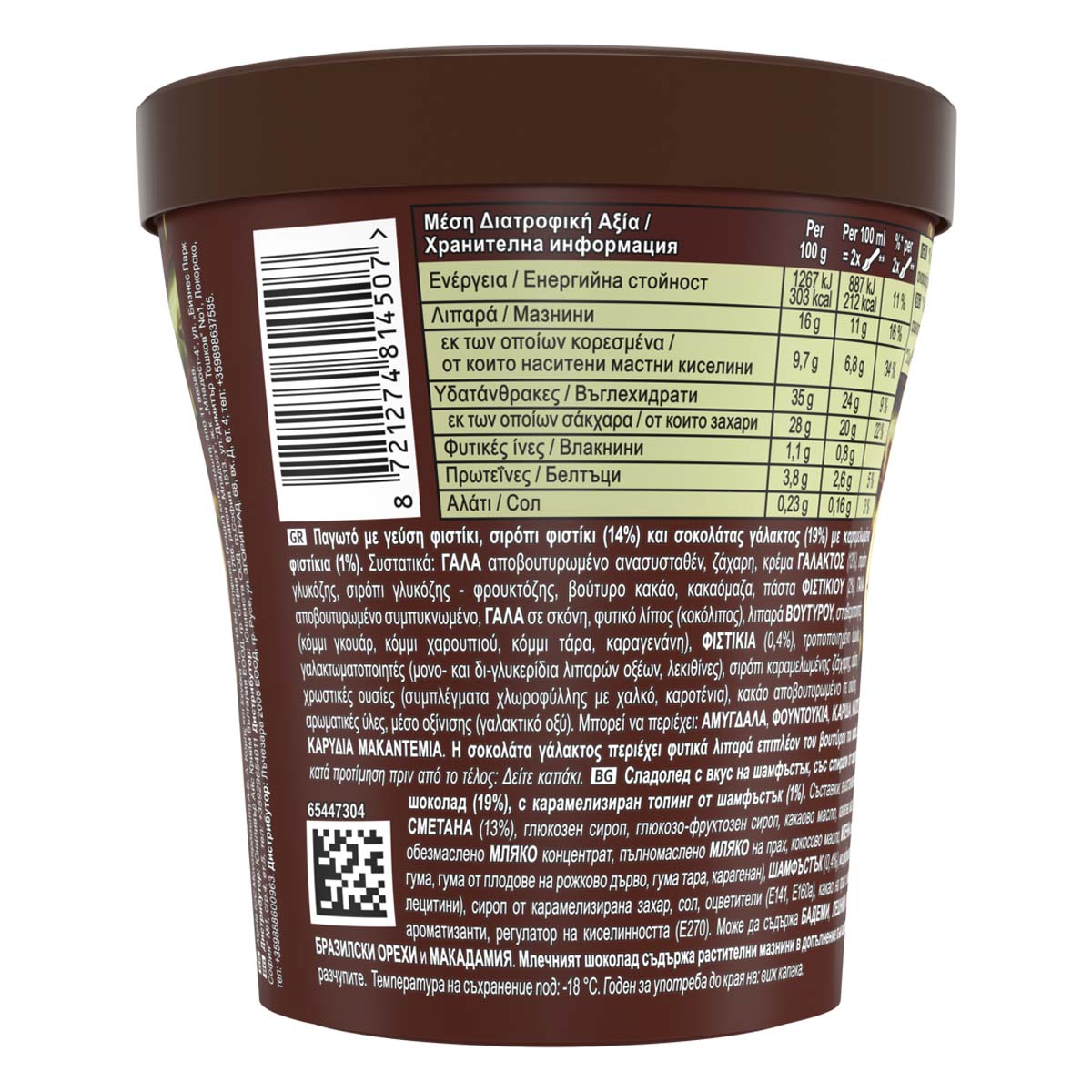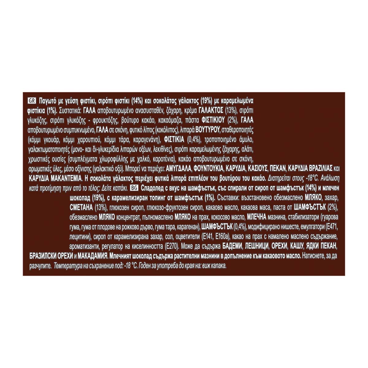 Παγωτό με γεύση φιστίκι, σιρόπι φιστίκι (14%) και σοκολάτας γάλακτος (19%) με καραμελωμένα φιστίκια (1%).