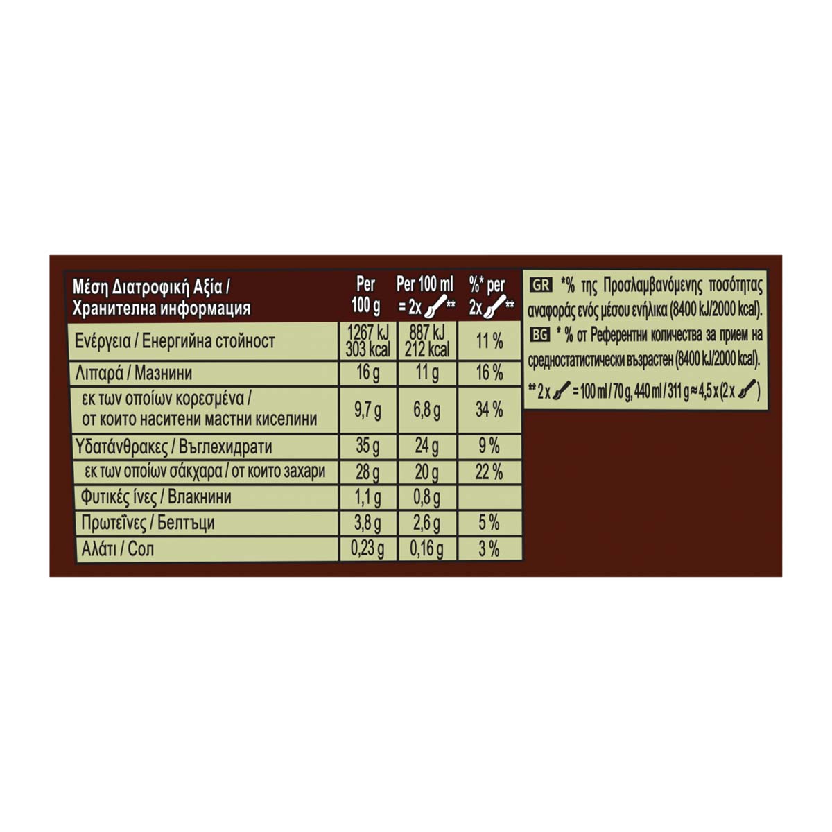 | Ενέργεια (ανά 100g) | 303 kcal |