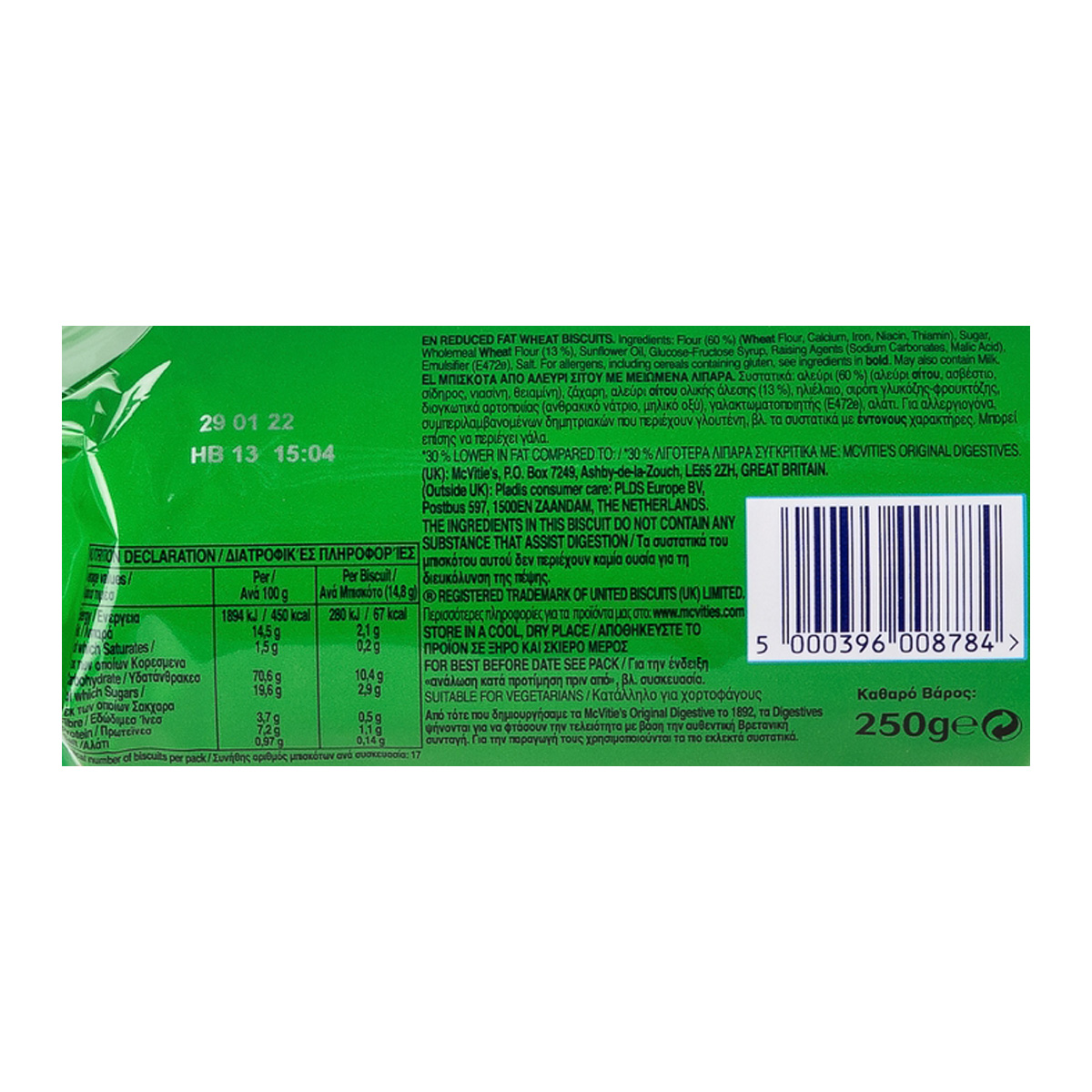 Τα McVities Digestive είναι νόστιμα μπισκότα σίτου που παρασκευάζονται βάσει μιας παραδοσιακής συνταγής, το μυστικό για την επίτευξη της ίδιας εξαιρετικής γεύσης. Αποτελούν πηγή φυτικών ινών και παρασκευάζονται από προσεκτικά επιλεγμένα υλικά. Τα πρώτα μπισκότα Digestive παρασκευάστηκαν το 1892 πήραν το όνομά τους από την υψηλή περιεκτικότητα σε σόδα που δρούσε θετικά στη διαδικασία της πέψης (Digestion). Με 30% λιγότερα λιπαρά.