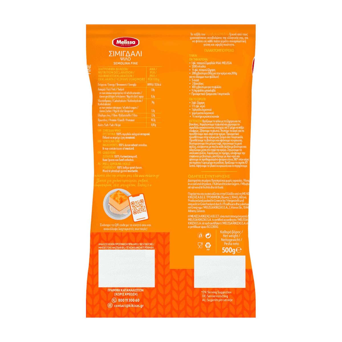 Το σιμιγδάλι Melissa παράγεται από ελληνικά σκληρά σιτάρια, έχει ωραία υφή, εξαιρετικό άρωμα και γεύση για σίγουρο αποτέλεσμα. Το σιμιγδάλι είναι προιόν άλεσης του σκληρού σίτου και αποτελεί αγαπημένο υλικό για την παρασκευή γλυκισμάτων. Το ψιλό σιμιγδάλι είναι ιδανικό για ραβανί και γαλακτομπούρεκο.