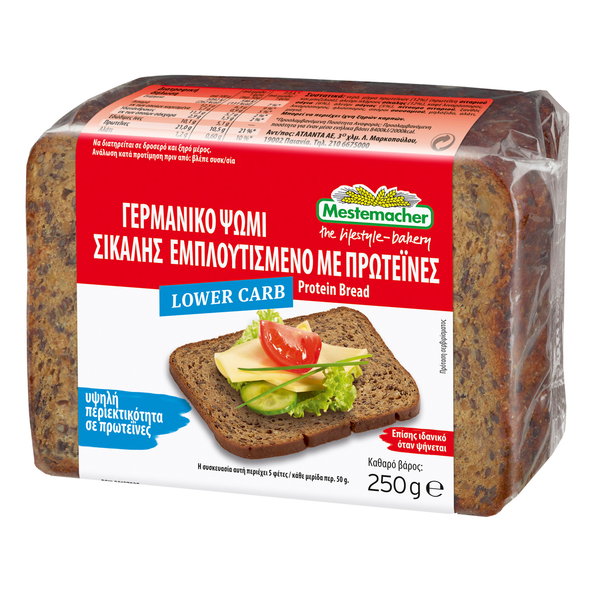 Φέτες ψωμιού με σίκαλη, εμπλουτισμένο με πρωτεΐνες και 82% λιγότερους υδατάνθρακες, σε σύγκριση με ένα συνηθισμένο ψωμί σίκαλης. Έτσι είναι κατάλληλο για τους λάτρεις του fitness! Εάν δεν ανοιχτεί, παραμένει φρέσκο έως έξι μήνες.