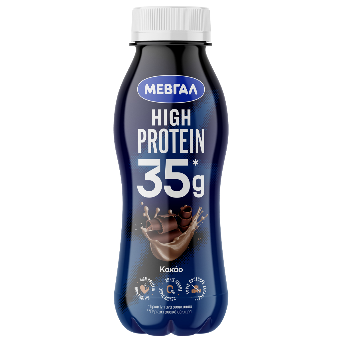 Προϊόν με βάση το άπαχο συμπυκνωμένο γάλα, 0,3% λιπαρά, με κακάο χαμηλών λιπαρών και γλυκαντικά. Πολύ υψηλής θερμικής επεξεργασίας. 35g πρωτεΐνη ανά συσκευασία.