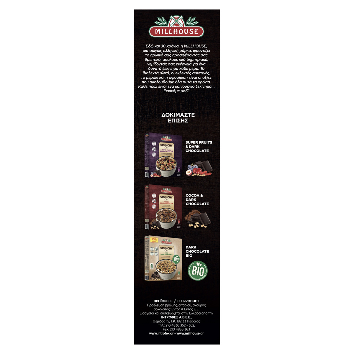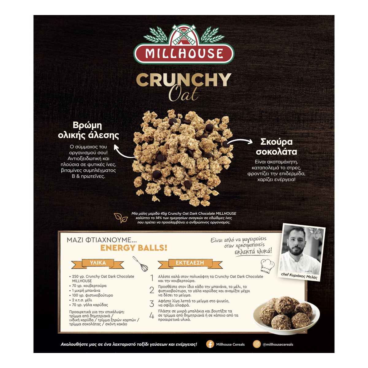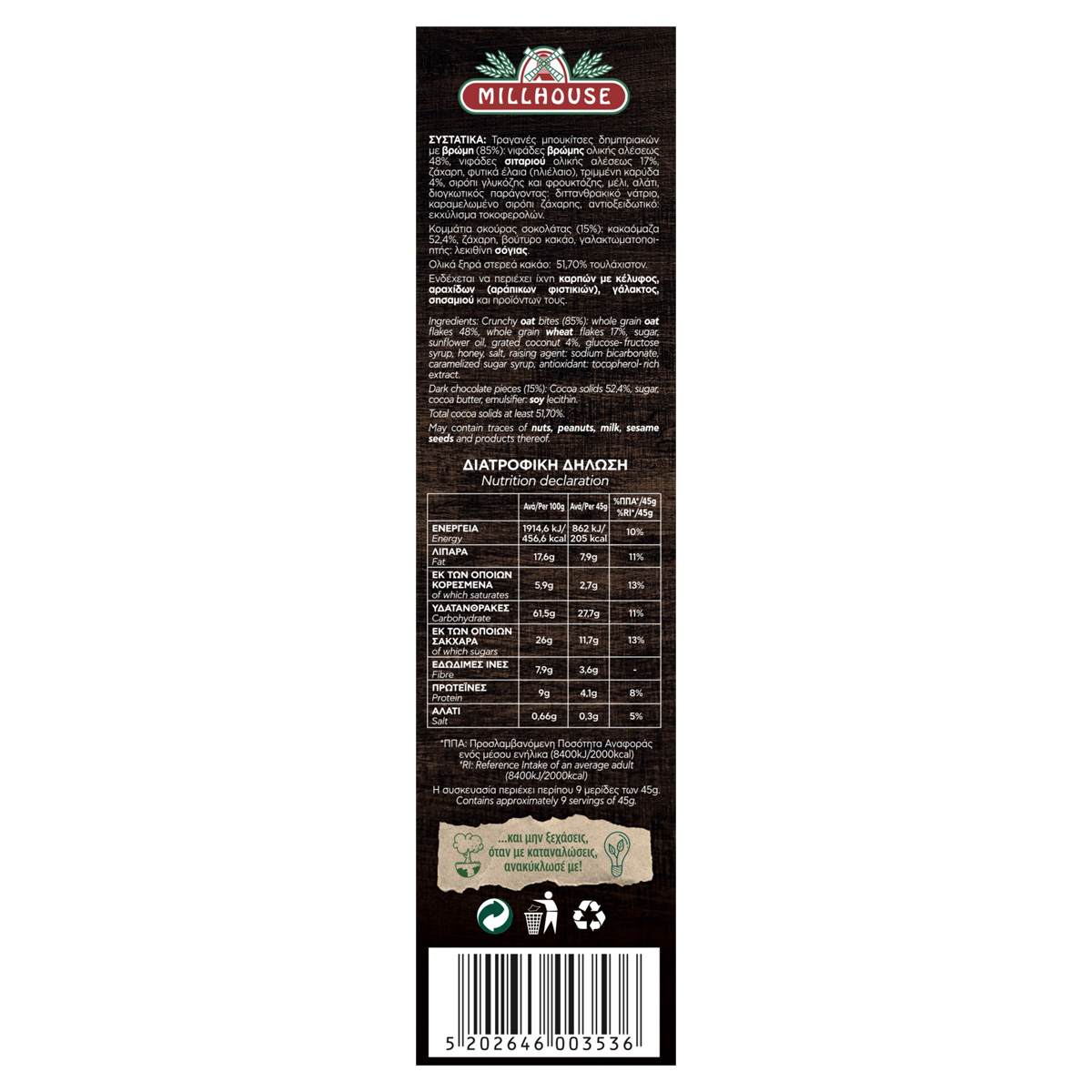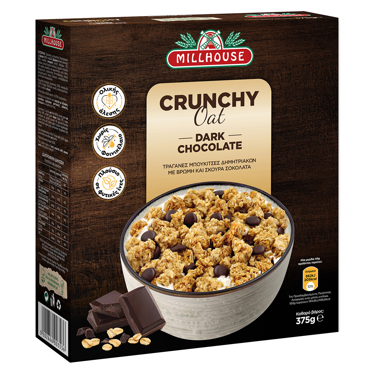 Το προϊόν Crunchy Oat Dark Dark Chocolate MILLHOUSE 375gr είναι τραγανές μπουκίτσες δημητριακών με βρώμη και σκούρα σοκολάτα. Τα δημητριακά ολικής άλεσης αποτελούν πλούσια πηγή φυτικών ινών που βοηθούν στην ομαλή πεπτική λειτουργία και συμβάλλουν στο αίσθημα της πληρότητας αποτρέποντας την υπερκατανάλωση τροφής. Η βρώμη ολικής άλεσης είναι ο σύμμαχος του οργανισμού! Αντιοξειδωτική και πλούσια σε φυτικές ίνες, βιταμίνες συμπλέγματος Β και πρωτεΐνες. Η σκούρα σοκολάτα είναι ακαταμάχητη, καταπολεμά το στρες, φροντίζει την επιδερμίδα και χαρίζει ενέργεια!