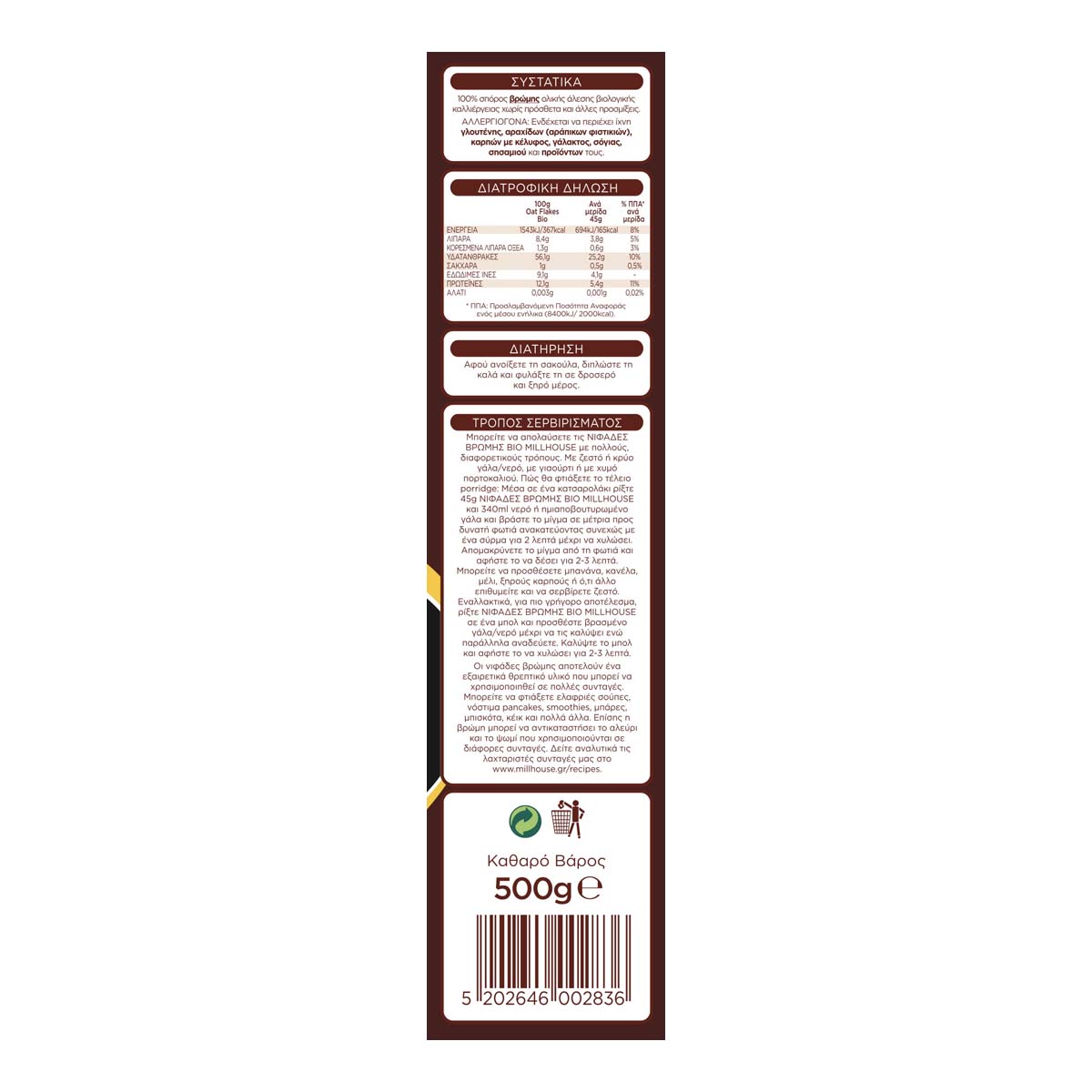 Το προϊόν Oat Flakes Bio MILLHOUSE 500gr είναι νιφάδες βρώμης ολικής άλεσης βιολογικής καλλιέργειας και είναι ένα 100% φυσικό προϊόν με πολλά οφέλη για την υγεία των ανθρώπων. Αποτελεί αναπόσπαστο κομμάτι μια υγιεινής διατροφής για όλες τις ηλικίες. Οι νιφάδες βρώμης BIO Millhouse αποτελούνται από συστατικά πολύ προσεκτικά και αυστηρά επιλεγμένα. Για το λόγο αυτό είμαστε βέβαιοι πως όλα τα υλικά προέρχονται από 100% βιολογική καλλιέργεια σύμφωνα με τους εν ισχύει διεθνείς κανονισμούς και κάθε στάδιο παραγωγής και επεξεργασίας τους συνοδεύεται από τα απαραίτητα πιστοποιητικά.