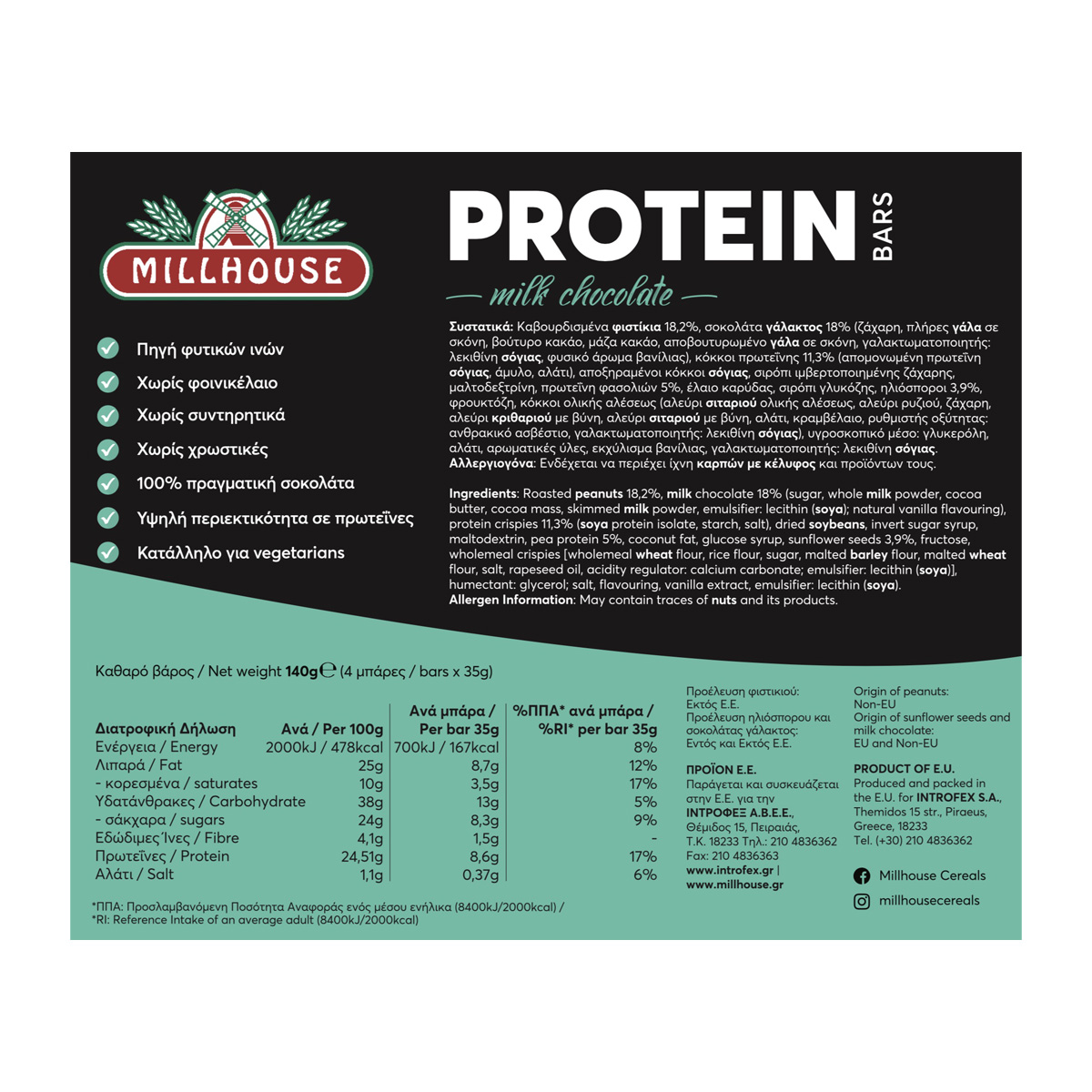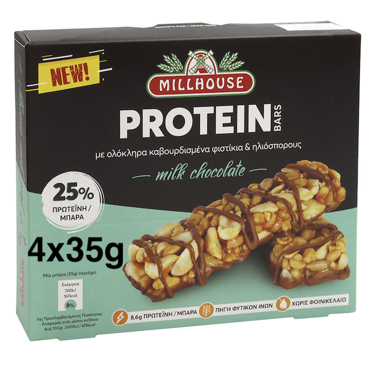 Οι Protein Bars Dark Chocolate MILLHOUSE είναι μπάρες με υψηλή περιεκτικότητα σε πρωτεΐνη, με ολόκληρα καβουρδισμένα φιστίκια, ηλιόσπορους και μαύρη σοκολάτα. Πλούσιες σε φυτικές ίνες, χωρίς συντηρητικά και χρωστικές και κατάλληλες για χορτοφάγους. Φορτίστε την ενέργεια και τη διάθεσή σας με την πιο φυσική πηγή πρωτεΐνης!