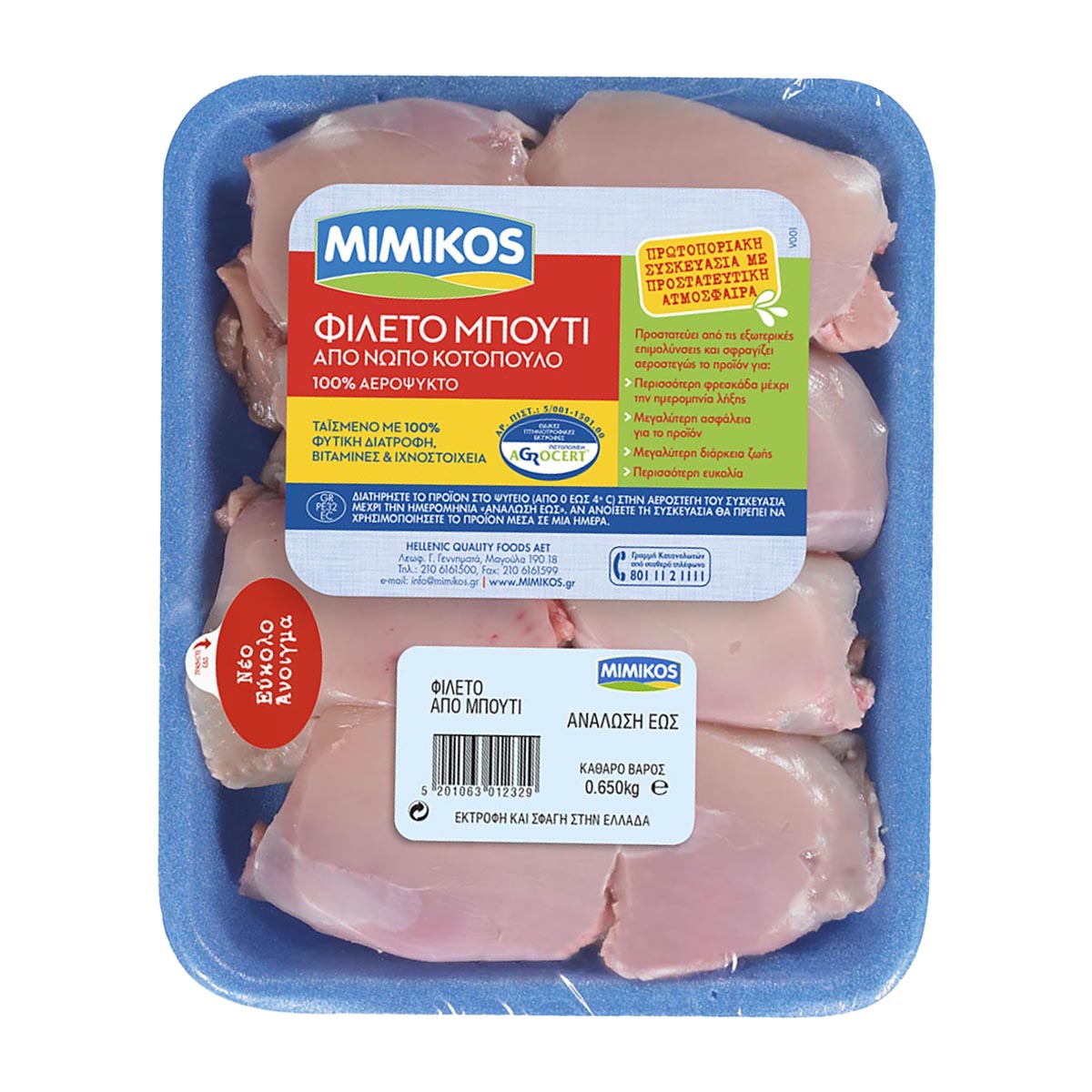 Φιλέτο από μπούτι κοτόπουλου μεγαλωμένο με το σύστημα MIMIKOS. Τα κοτόπουλα MIMIKOS έχουν τραφεί με 100% φυτικές τροφές, βιταμίνες και ιχνοστοιχεία και πιστοποιούνται από τον AGROCERT για την ειδική αυτή εκτροφή.