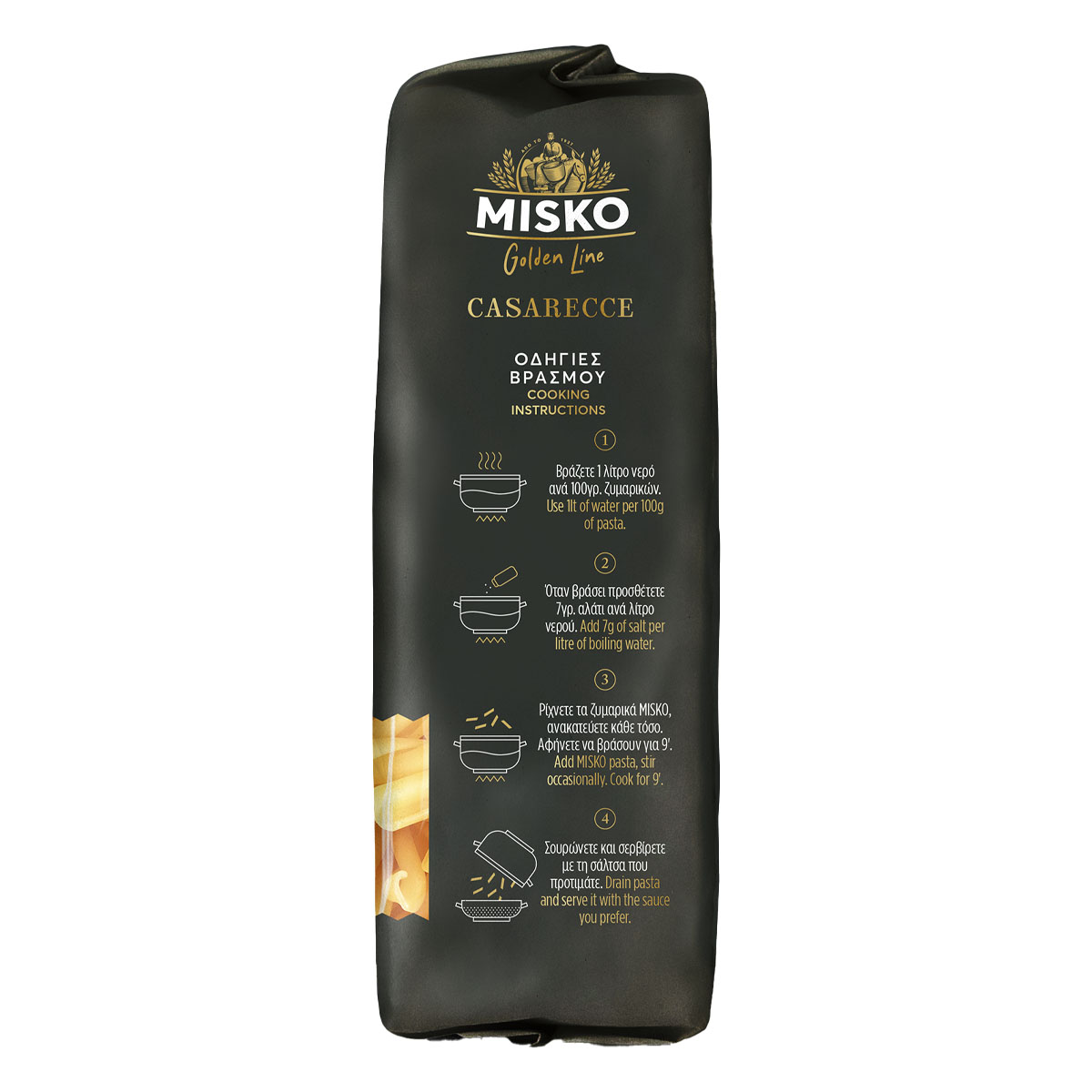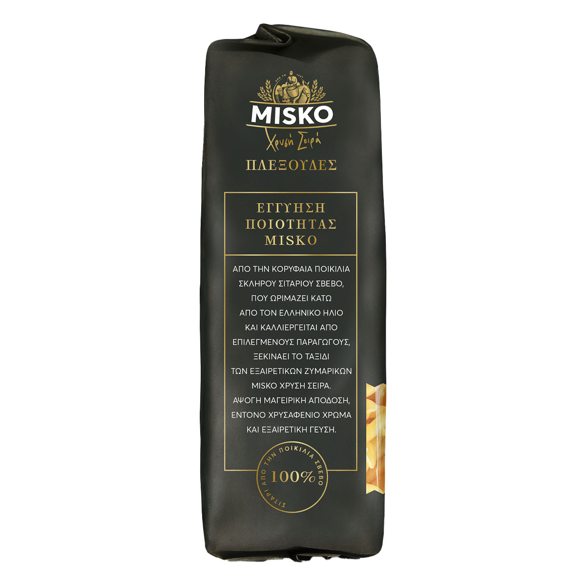 Τα μακαρόνια MISKO πλεξούδες χρυσή σειρά τιμούν ιδιαίτερα το το όνομά τους, το οποίο φυσικά έχουν πάρει από το χαρακτηριστικό σχήμα τους, και γι’ αυτό αγαπούν να “δένονται” με λαχταριστές σάλτσες. Είναι ζυμαρικά που δείχνουν μια προτίμηση στις μεσογειακές και τις παχύρευστες κόκκινες αλλά συνδυάζονται αρμονικά και με λευκές:πλεξούδες με κόκκινη σάλτσα, αντζούγιες και ελιές ή πλεξούδες με χοιρινό, μανιτάρια και κατίκι και το αποτέλεσμα είναι αξεπέραστο γευστικά αλλά και ποιοτικά!