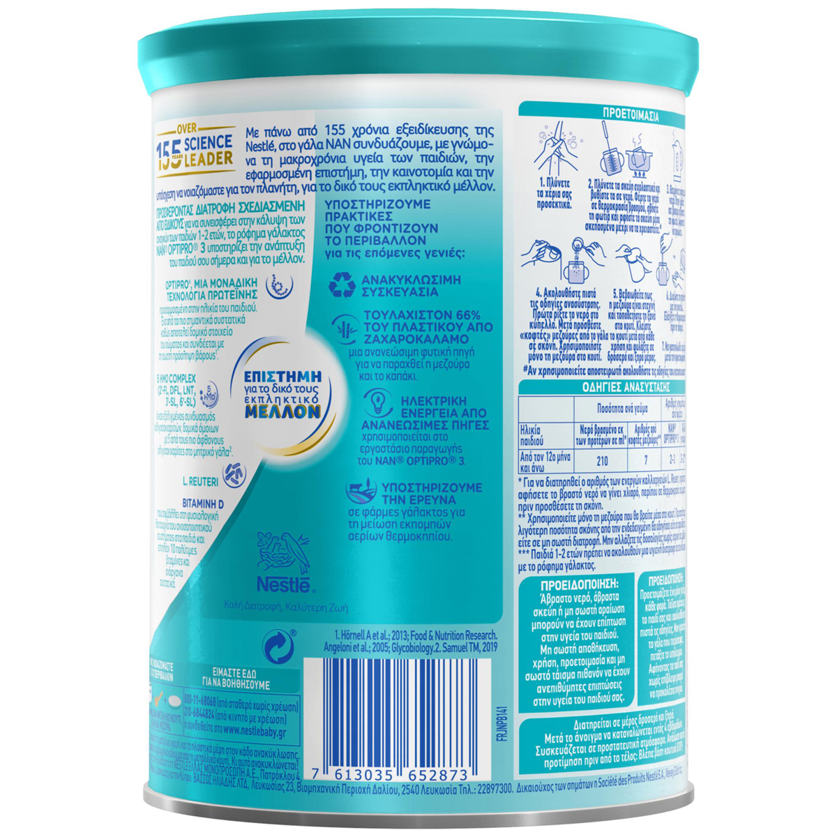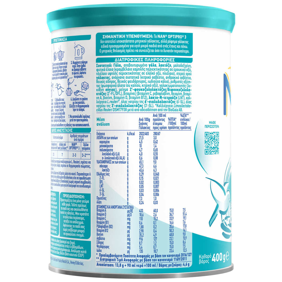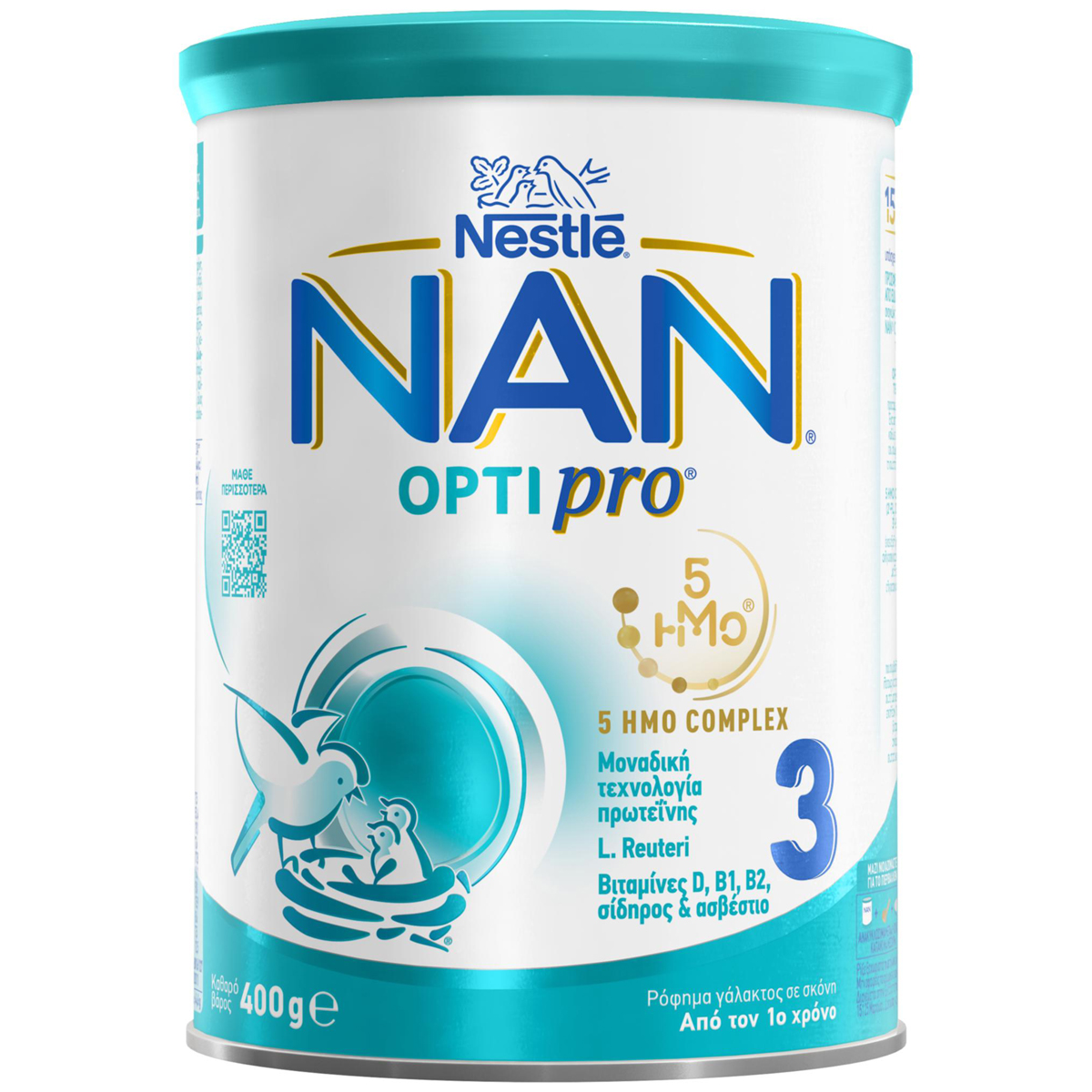 NESTLE NAN OPTIPRO 5 ΗΜΟ Complex 3 400g. Ρόφημα γάλακτος σε σκόνη από τον πρώτο χρόνο. ΠΡΟΣΦΕΡΟΝΤΑΣ ΔΙΑΤΡΟΦΗ ΣΧΕΔΙΑΣΜΕΝΗ ΑΠΟ ΕΙΔΙΚΟΥΣ για να συνεισφέρει στην κάλυψη αναγκών των παιδιών 1-2 ετών, το ρόφημα γάλακτος NAN® OPTIPRO® 3 υποστηρίζει την ανάπτυξη του παιδιού σου σήμερα και για το μέλλον. OPTIPRO®, ΜΙΑ ΜΟΝΑΔΙΚΗ ΤΕΧΝΟΛΟΓΙΑ ΠΡΩΤΕΪΝΗΣ προσαρμοσμένη στην ηλικία του παιδιού. Ένα από τα πιο σημαντικά συστατικά καθώς αποτελεί δομικό στοιχείο του σώματος και συνδέεται με τη σωστή πρόσληψη βάρους1. 5 ΗΜΟ COMPLEX (2’-FL, DFL, LNT, 3’-SL, 6’-SL), ένας εξελιγμένος συνδυασμός ολιγοσακχαριτών, δομικά όμοιων με 5 από τους πιο άφθονους ολιγοσακχαρίτες στο μητρικό γάλα2. L.REUTERI. ΒΙΤΑΜΙΝΗ D που συμβάλλει στη φυσιολογική λειτουργία του ανοσοποιητικού συστήματος στα παιδιά και επιπλέον 10 πολύτιμες βιταμίνες και ανόργανα συστατικά.
