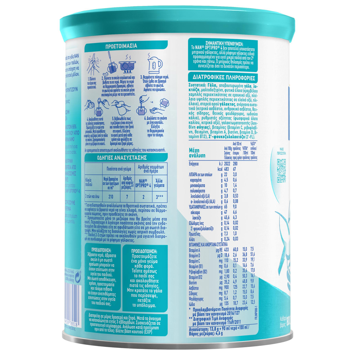 Ρόφημα γάλακτος σε σκόνη από το δεύτερο χρόνο. Με πάνω από 155 χρόνια εξειδίκευσης της Nestle, στο γάλα ΝΑΝ συνδυάζουμε, με γνώμονα τη μακροχρόνια υγεία των παιδιών, την εφαρμοσμένη επιστήμη, την καινοτομία και την υπόσχεση να νοιαζόμαστε για τον πλανήτη, για το δικο τους εκπληκτικό μέλλον. ΠΡΟΣΦΕΡΟΝΤΑΣ ΔΙΑΤΡΟΦΗ ΣΧΕΔΙΑΣΜΕΝΗ ΑΠΟ ΕΙΔΙΚΟΥΣ για να συνεισφέρει στην κάλυψη των αναγκών των παιδιών 2-3 ετών, το ρόφημα γάλακτος ΝΑΝ® OPTIPRO® 4 υποστηρίζει την ανάπτυξη του παιδιού σου σήμερα και για το μέλλον.