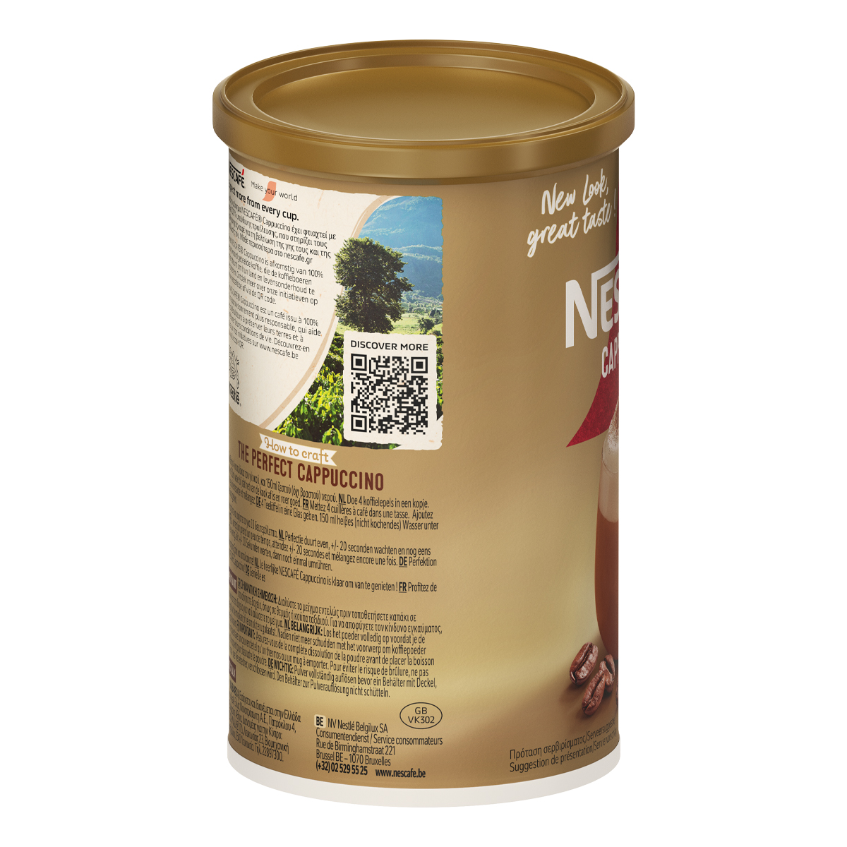 Ανακαλύψτε τον νέο NESCAFE GOLD Cappuccino. Ένας συνδυασμός από προσεκτικά συστατικά φυσικής προέλευσης*. Το μυστικό κρύβεται στον συνδυασμό κόκκων ποικιλίας Arabica καλλιεργημένων σε μεγάλο υψόμετρο και κόκκων ποικιλίας Robusta που δίνουν πλούσια και μεστή γεύση στο ρόφημα, ενώ το πλούσιο σε γεύση γάλα προσδίδει βελούδινη κρέμα, δημιουργώντας μια μοναδική εμπειρία καφέ. Με την ποσότητα της συσκευασίας μπορείτε να φτιάξετε 17-20 μερίδες.