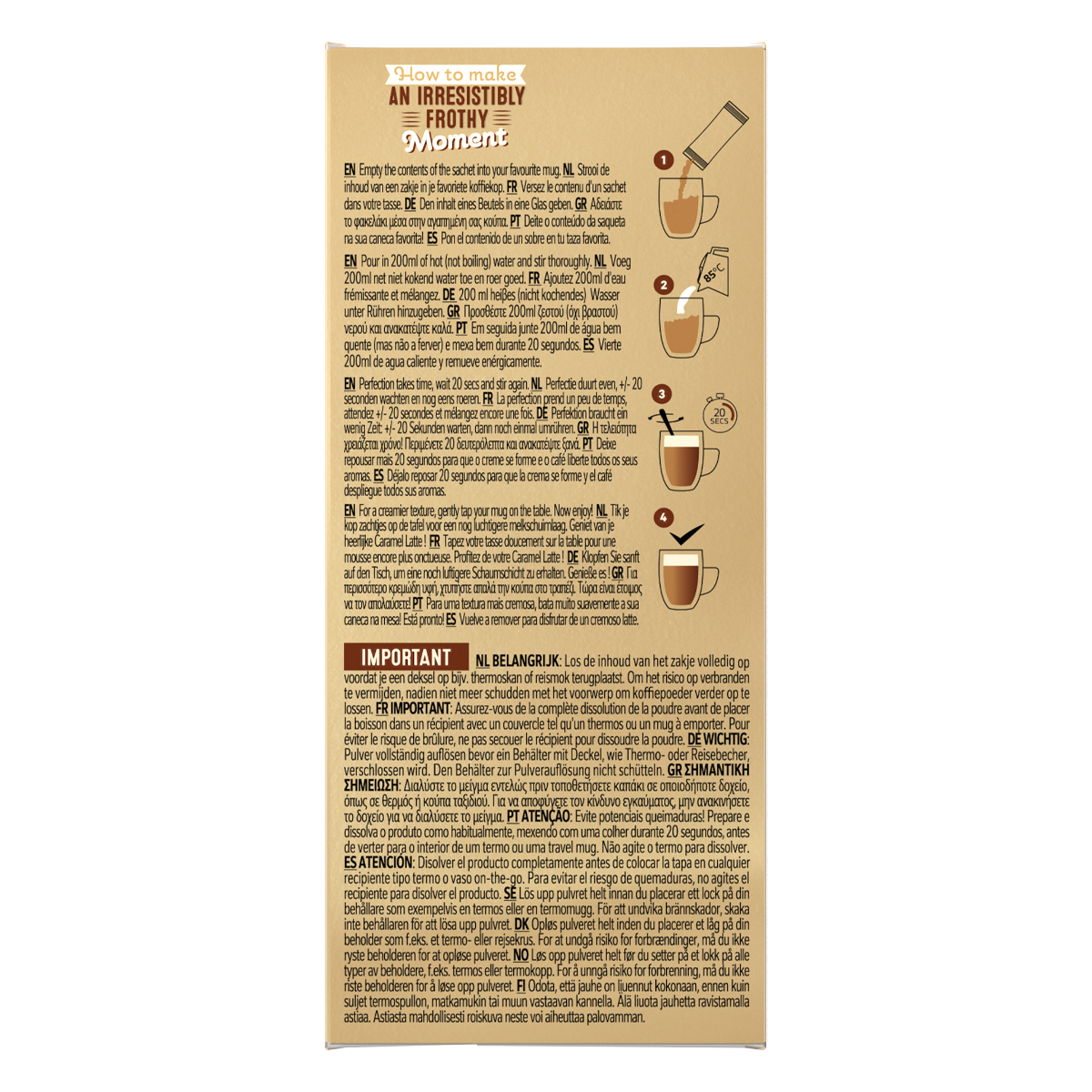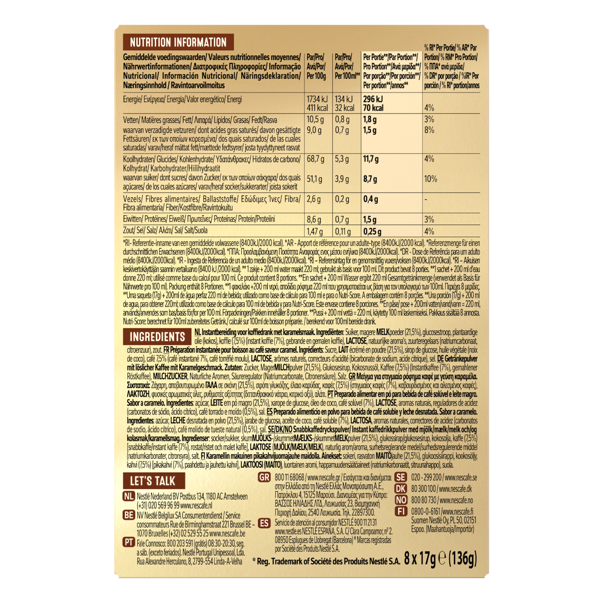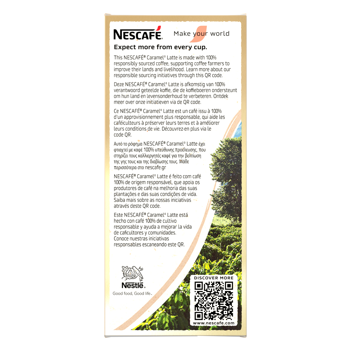 Ανακάλυψε το νέο NESCAFE® GOLD Caramel Latte, ένα ρόφημα με προσεκτικά επιλεγμένα συστατικά φυσικής προέλευσης*. Η τέλεια ισορροπία κόκκων από τις ποικιλίες Arabica και Robusta, σε συνδυασμό με γευστικό αφρόγαλα. Ενα ακαταμάχητα βελούδινο και πλούσιο γευστικό αποτέλεσμα.Θέλεις κάτι απαλό και μοναδικά απολαυστικό, με αισθησιακή γεύση και πλούσιο άρωμα; Η λύση είναι μία, NESCAFE® GOLD CARAMEL LATTE… Μία πρωτόγνωρη γευστική εμπειρία ξετυλίγεται μπροστά σου, τόσο απλά! Η συσκευασία περιέχει 8 φακελάκια.