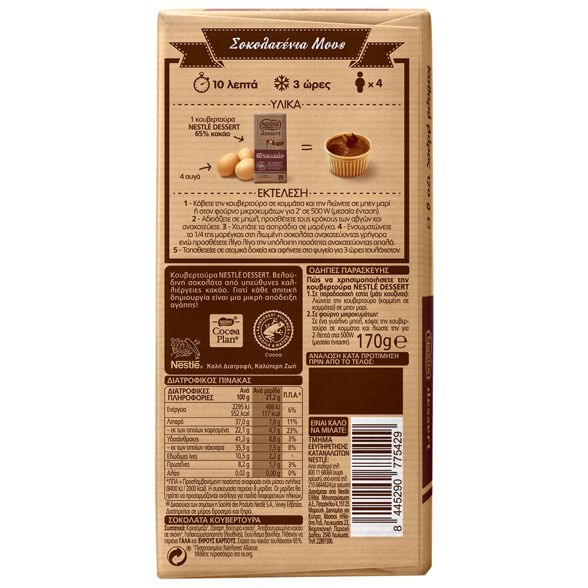 ΚΟΥΒΕΡΤΟΥΡΑ NESTLE® DESSERT 65% ΚΑΚΑΟ Iδανική σοκολάτα κουβερτούρα που λιώνει τέλεια με πλούσιο άρωμα, φυσικό εκχύλισμα βανίλιας Μαδαγασκάρης και βελούδινη υφή, για πιο έντονη γεύση κακάο στα γλυκά σας. Για πιο έντονη γεύση κακάο στα γλυκά σας και με εκχύλισμα φυσικής βανίλιας, με την κουβερτούρα NESTLE DESSERT 65% Κακάο η δημιουργία των πιο σοκολατένιων γλυκών θα είναι παιχνιδάκι. Παρασκευάζεται από επιλεγμένες ποικιλίες κακάο αλλά και από τα πιο αγνά υλικά, όπως είναι το φυσικό εκχύλισμα βανίλιας. Περιέχει 100% βούτυρο του κακάο (χωρίς χρήση επιπλέον φυτικών λιπαρών) για να σας προσφέρει άριστη ποιότητα. Έχει τέλεια γεύση, πλούσιο άρωμα και βελούδινη υφή. Σας προσφέρει αμέτρητες δυνατότητες για να εμπνευστείτε, για να δημιουργήσετε τα πιο επιτυχημένα γλυκά και να εντυπωσιάσετε και τους πιο απαιτητικούς λάτρεις της σοκολάτας.