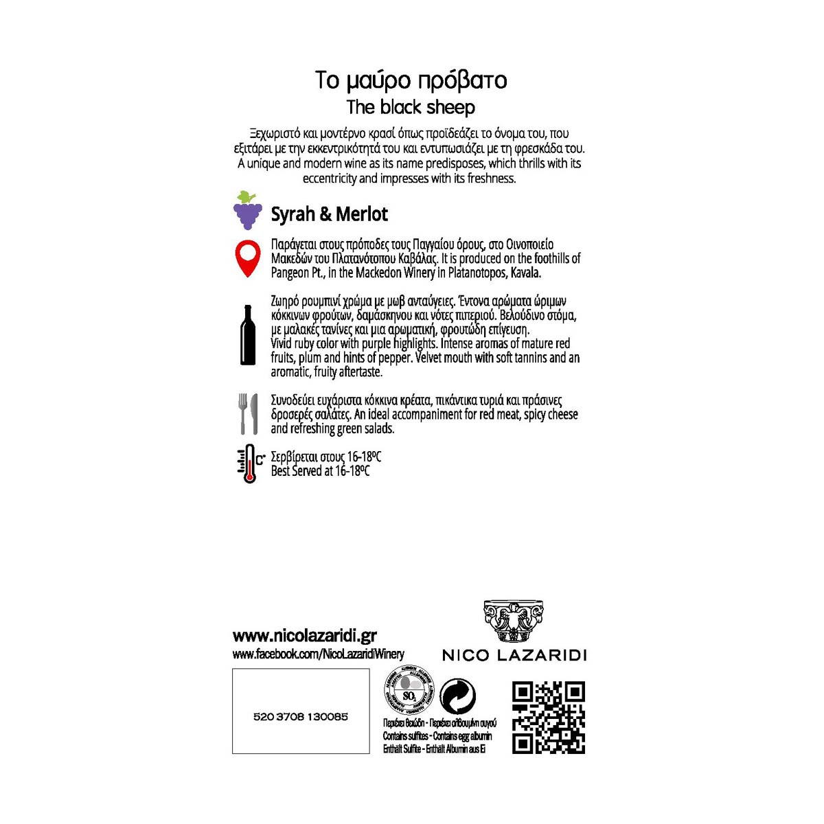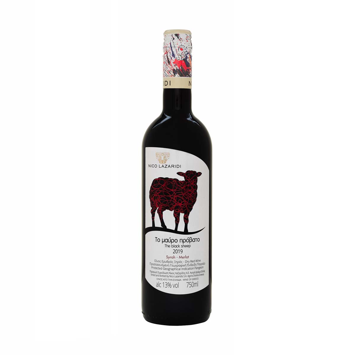 Το Μαύρο Πρόβατο, ένα όνομα εκκεντρικό για ένα προϊόν που τονίζει τη διαφορετικότητα και την ιδιαιτερότητα του. Η νεοκοσμήτικη φιλοσοφία του διαφαίνεται τόσο από το βιδωτό του πώμα,την trendy εμφάνισή του αλλά και την φρεσκάδα που το χαρακτηρίζει. Για το Μαύρο Πρόβατο ερυθρό επιλέξαμε τις ποικιλίες Syrah και Merlot, των οποίων η καλλιέργεια στους πρόποδες του Παγγαίου όρους έχει φέρει πολύ καλά αποτελέσματα.