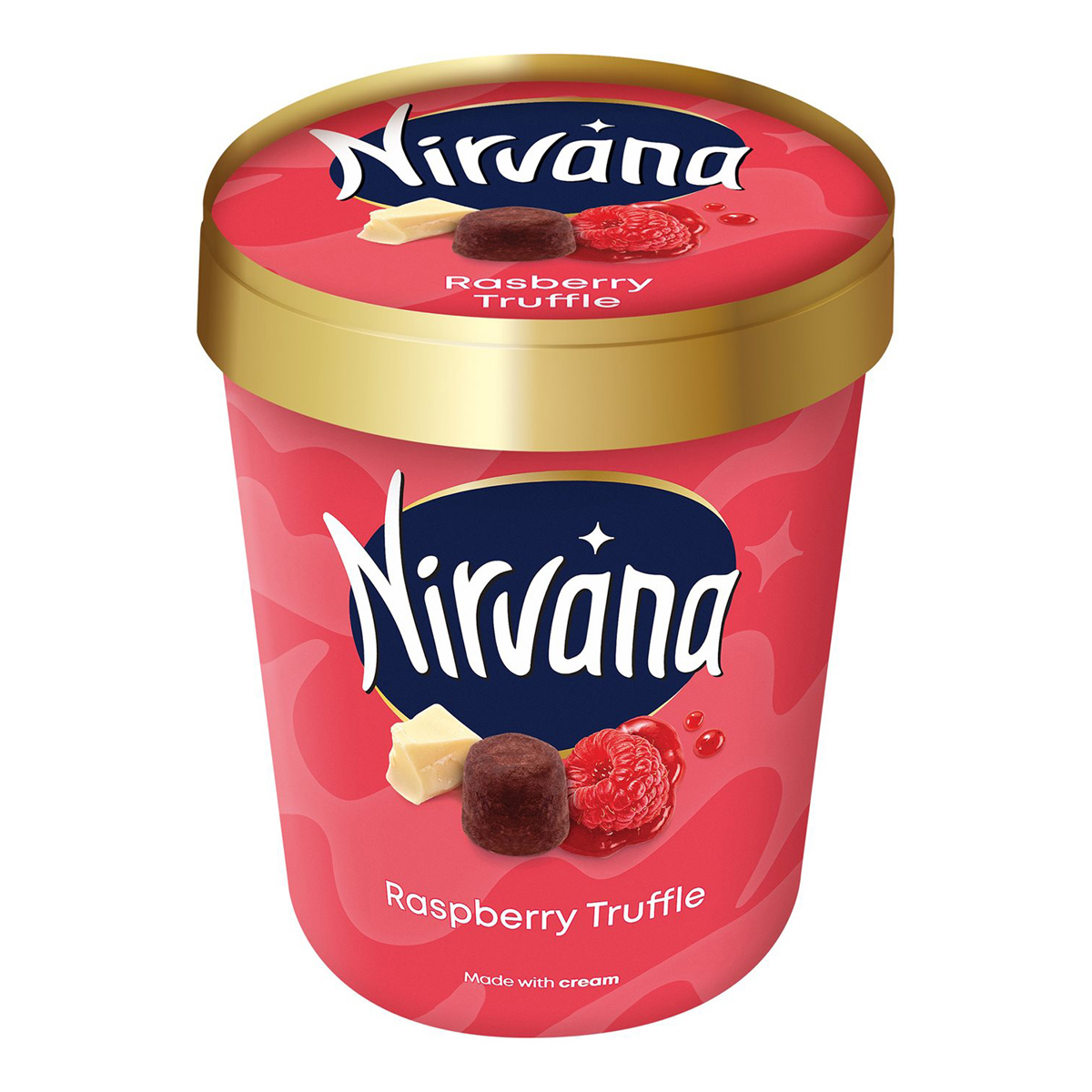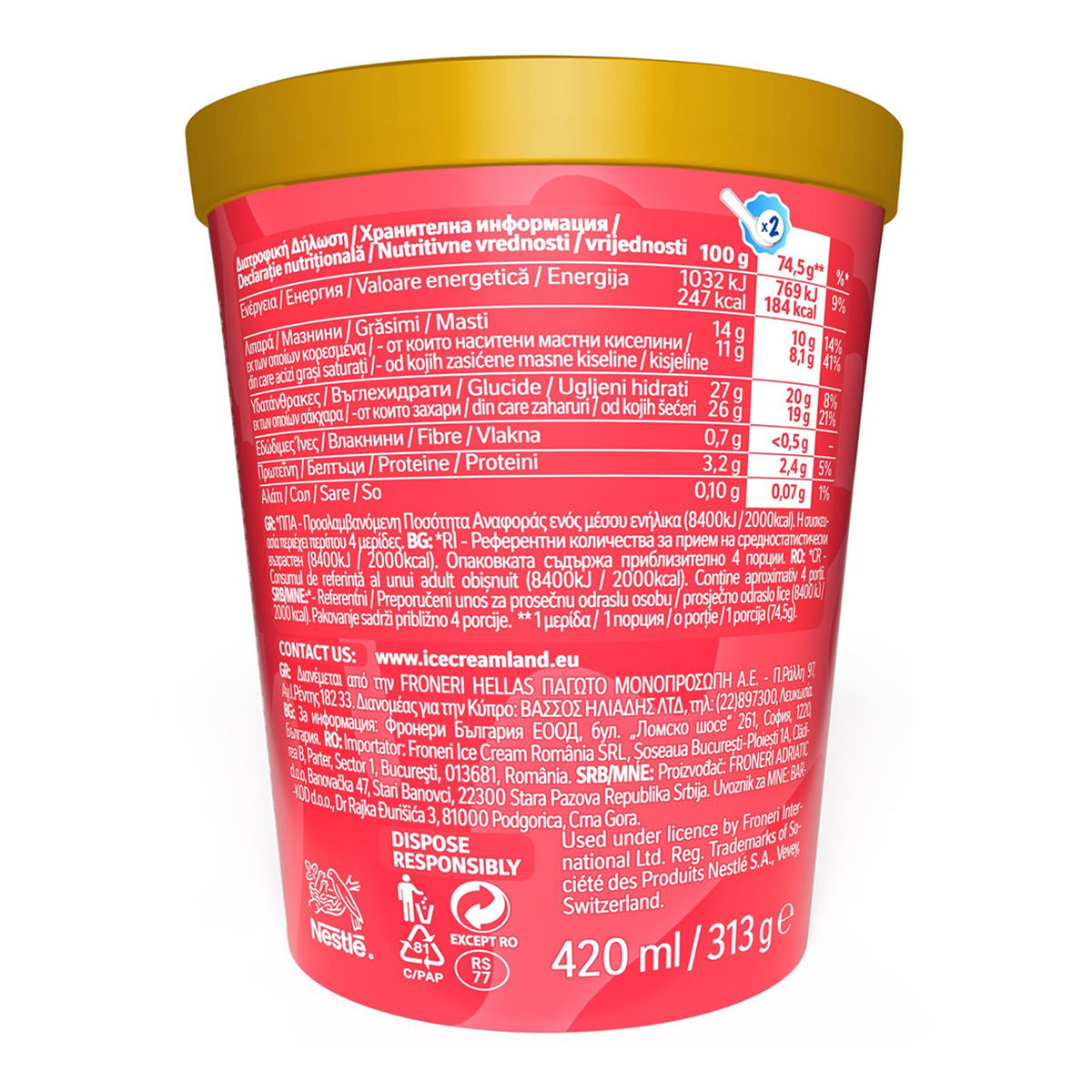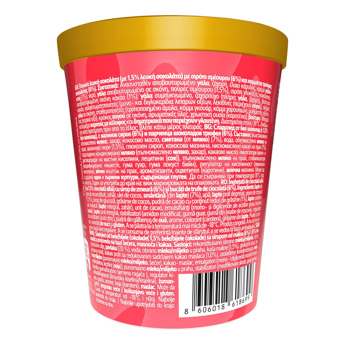 Παγωτό λευκή σοκολάτα (με 1,5% λευκή σοκολάτα) με σιρόπι σμέουρου (6%) και κομμάτια τρούφας σοκολάτας (6%).
