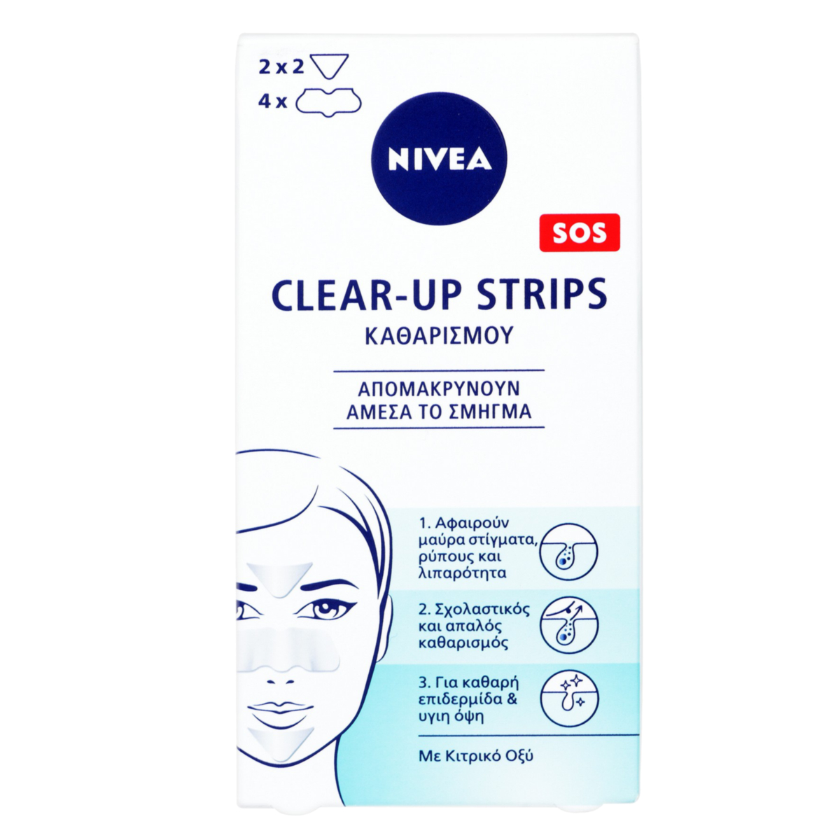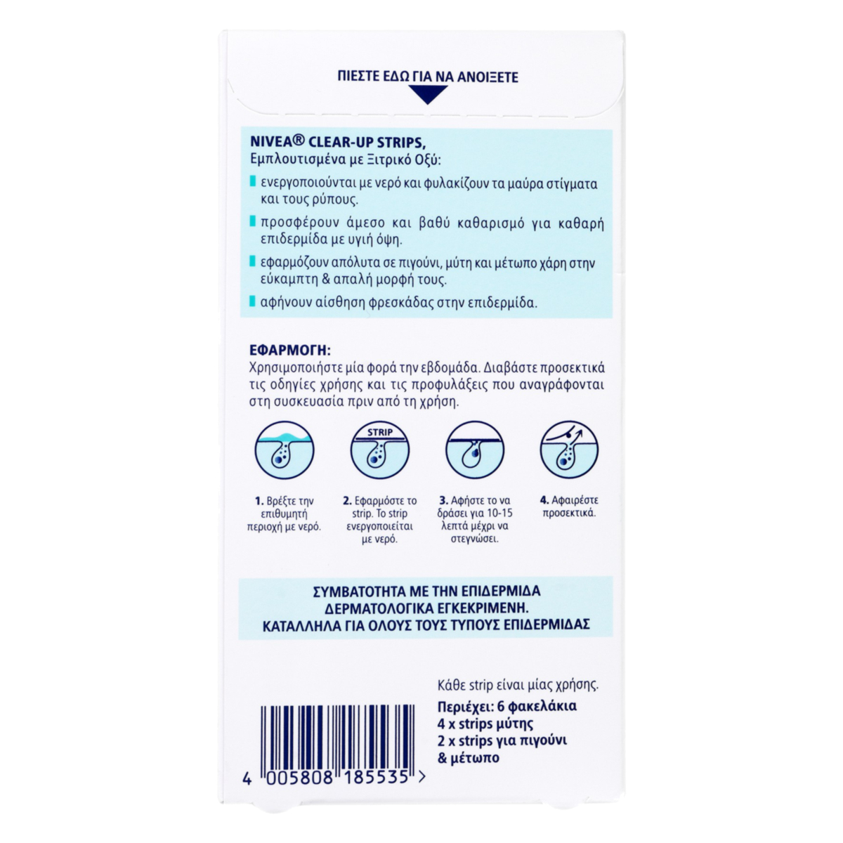 Οι ταινίες NIVEA Clear-Up Strips αφαιρούν το σμήγμα από τους κλειστούς πόρους και απελευθερώνουν την επιδερμίδα από τη σκόνη, αναζωογονώντας την και μειώνοντας τους ορατούς πόρους. Τα Clear-Up Strips: Αφαιρούν αποτελεσματικά τα μαύρα στίγματα από την περιοχή T (μέτωπο - μύτη - πηγούνι). Ενεργοποιούνται με το νερό, κολλούν στα μαύρα στίγματα και τις ατέλειες για να καθαρίσουν σε βάθος την επιδερμίδα. Κατάλληλα για περιοχές του προσώπου που δεν είναι λείες, ειδικά στη μύτη, χάρη στην ειδική απαλή ύφανση.