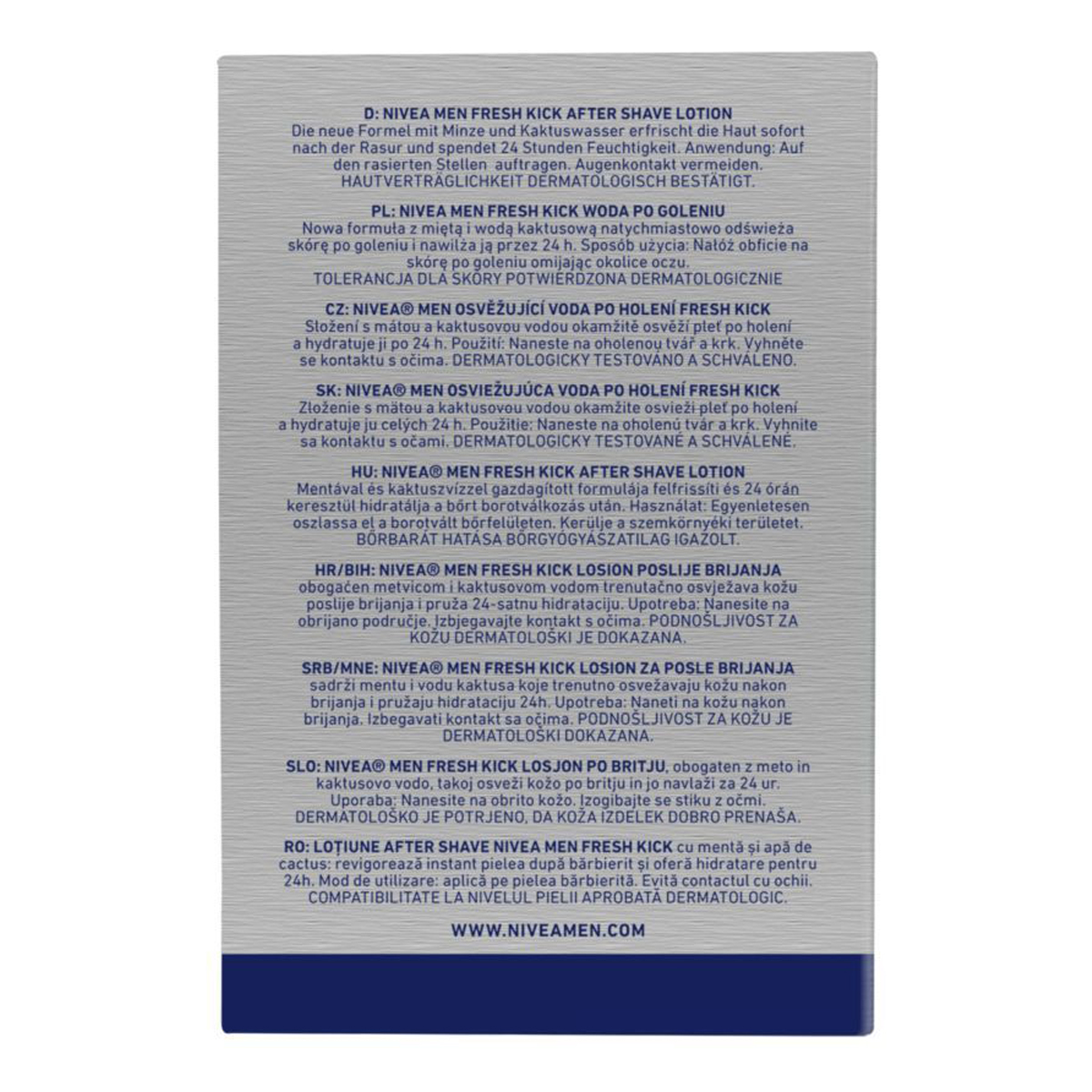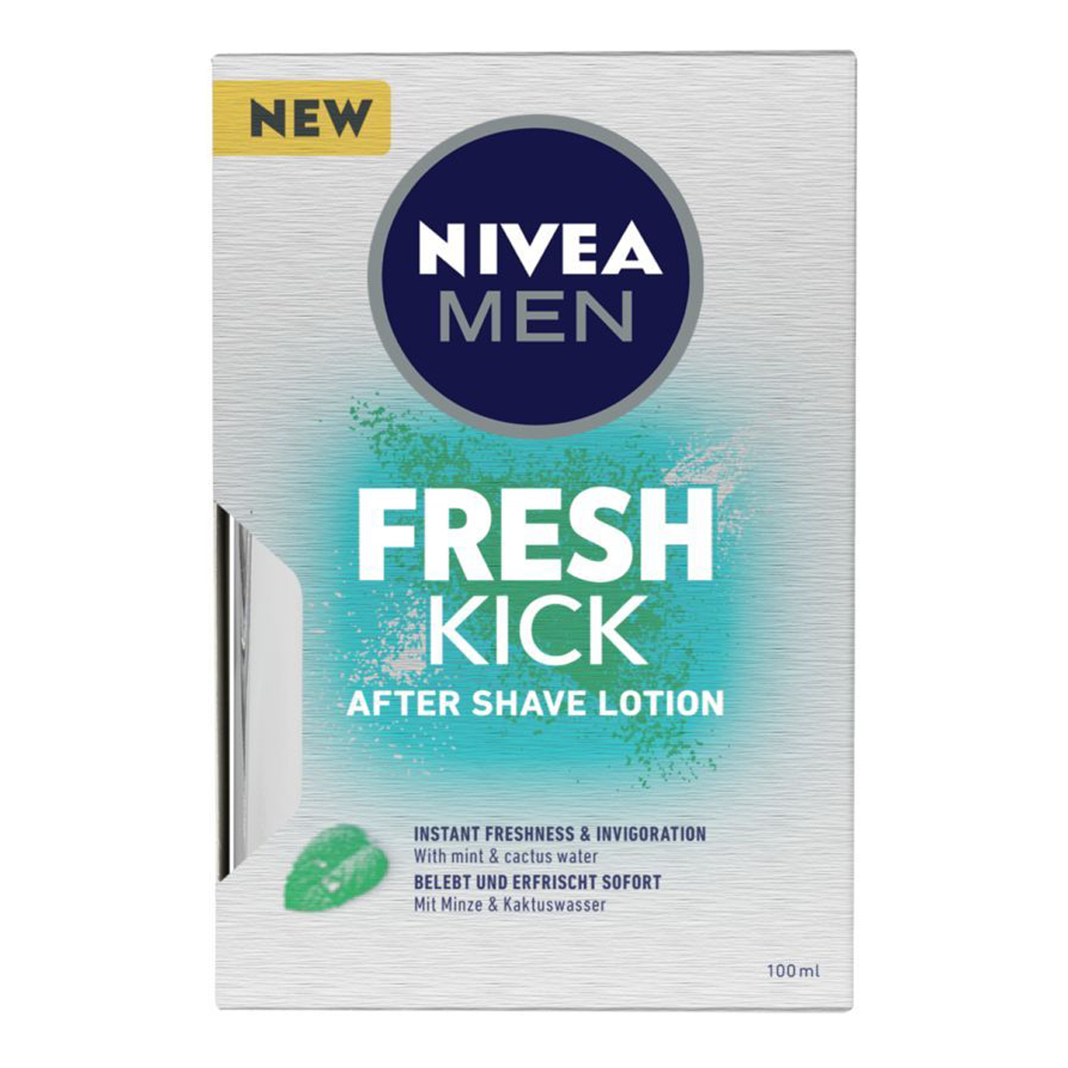 Το NIVEA MEN Kick Fresh After Shave Lotion προσφέρει άμεση ανακούφιση της επιδερμίδας μετά από το ξύρισμα. Η σύνθεσή του περιέχει εκχύλισμα μέντας και Cactus Water, τη βιταμίνη Ε και την προβιταμίνη Β5 και ανακουφίζει, τονώνει και αναζωογονεί την ξυρισμένη επιδερμίδα του προσώπου. Για επιδερμίδα γεμάτη ενέργεια με αίσθηση αναζωογόνησης.