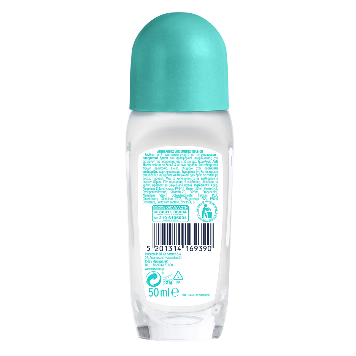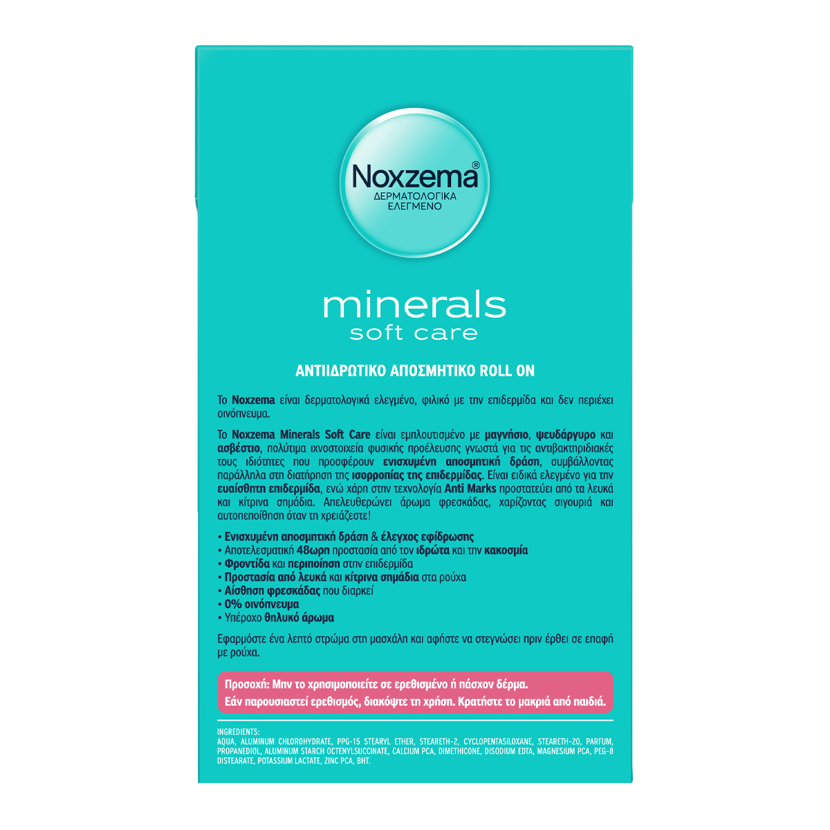 To γυναικείο αντιιδρωτικό αποσμητικό rollon Noxzema Minerals Soft Care, είναι εμπλουτισμένο με μαγνήσιο, ψευδάργυρο & ασβέστιο, πολύτιμα ιχνοστοχεία φυσικής προέλευσης γνωστά για τις αντιβακτηριδιακές τους ιδιότητες που προσφέρουν ενισχυμένη αποσμητική δράση, συμβάλλοντας παράλληλα στη διατήρηση της ισορροπίας της επιδερμίδας. Προσφέρει αποτελεσματική 48ωρη προστασία από τον ιδρώτα και την κακοσμία και αίσθηση φρεσκάδας που διαρκεί. Είναι ειδικά ελεγμένο για την ευαίσθητη επιδερμίδα, ενώ χάρη στην τεχνολογία Anti Marks, προστατεύει από τα λευκά και κίτρινα σημάδια στα ρούχα. Είναι δερματολογικά ελεγμένο, φιλικό με την επιδερμίδα, έχει απαλό θηλυκό άρωμα και δεν περιέχει οινόπνευμα. Εφαρμόστε ένα λεπτό στρώμα στην περιοχή της μασχάλης.