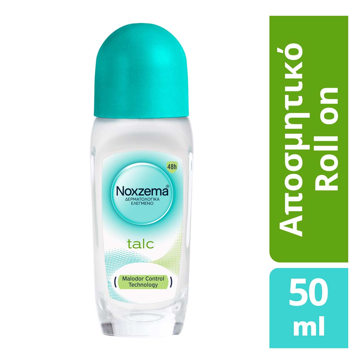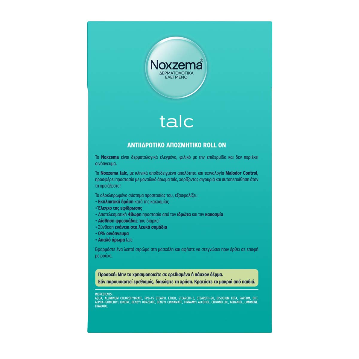 To γυναικείο αντιιδρωτικό αποσμητικό rollon Noxzema Talc, με κλινικά αποδεδειγμένη απαλότητα, τεχνολογία Malodor Control και μοναδικό άρωμα talc, απελευθερώνει άρωμα φρεσκάδας που διαρκεί, εξασφαλίζει έλεγχο της εφίδρωσης και προσφέρει αποτελεσματική 48ωρη προστασία από τον ιδρώτα και την κακοσμία. Είναι δερματολογικά ελεγμένο, φιλικό με την επιδερμίδα, έχει σύνθεση ενάντια στα λευκά σημάδια, απαλό θηλυκό άρωμα και δεν περιέχει οινόπνευμα. Εφαρμόστε ένα λεπτό στρώμα στην περιοχή της μασχάλης.