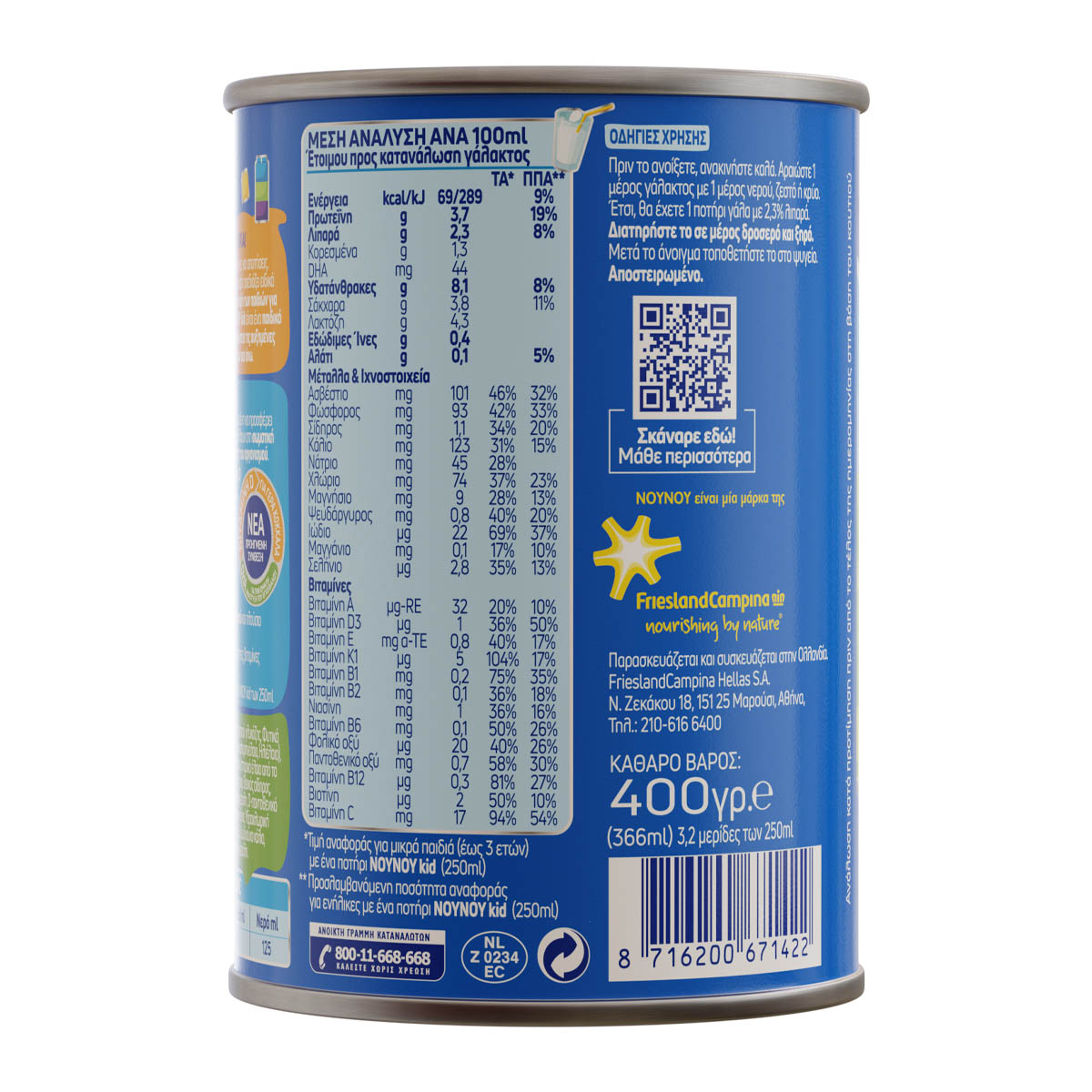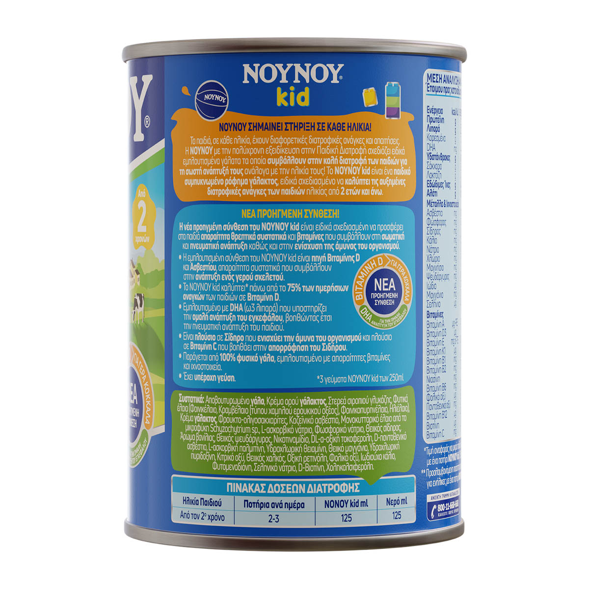 Το ΝΟΥΝΟΥ kid είναι ειδικά μελετημένο για παιδιά από 2 ετών καθώς προσφέρει στις ιδανικές αναλογίες απαραίτητα θρεπτικά συστατικά, που συμβάλλουν στην καλύτερη σωματική και διανοητική τους ανάπτυξη. Η προηγμένη σύνθεση του NOYNOY kid: Συμβάλει στην ανάπτυξη ενός γερού σκελετού αφού προσφέρει ένα πολύτιμο συνδυασμό ασβεστίου, μαγνησίου και βιταμίνης D. Συμβάλει στην καλύτερη πνευματική ανάπτυξη αφού είναι πλούσιο σε ιώδιο & σίδηρο και έχει υπέροχη γεύση.