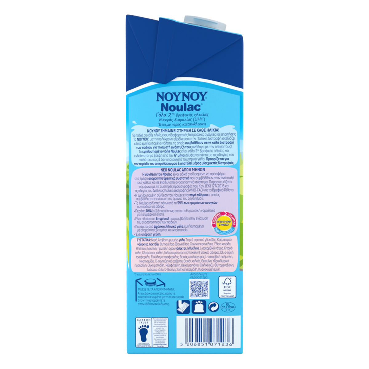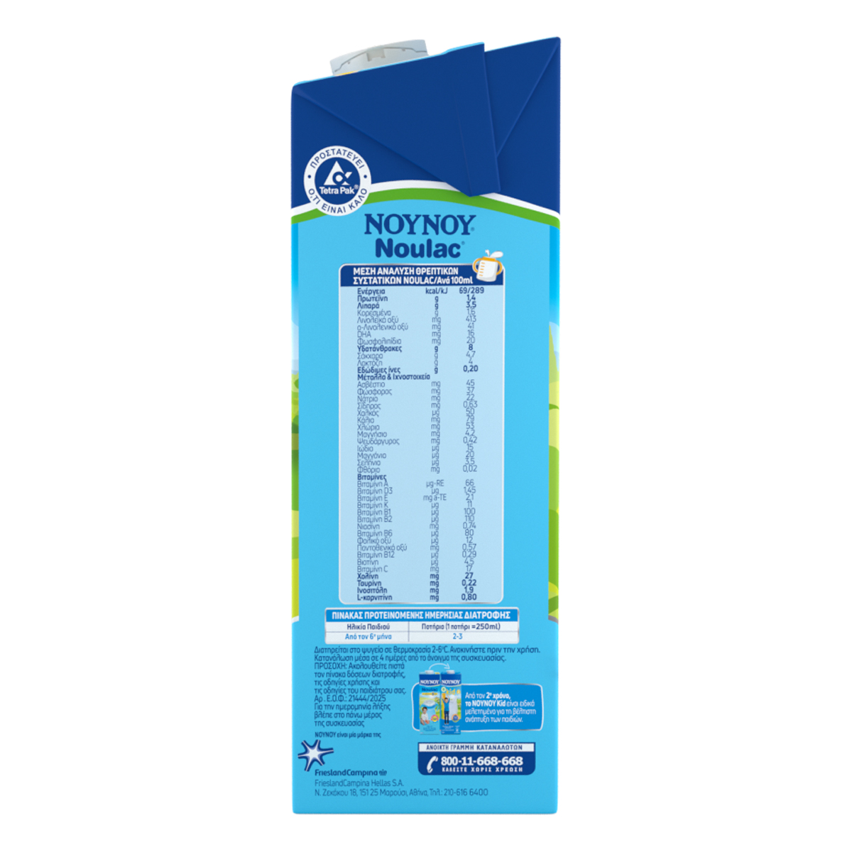 Η νέα σύνθεση του ΝΟΥΝΟΥ Noulac 1Lt από τον 6ο μήνα είναι ειδικά σχεδιασμένη να προσφέρει στα βρέφη απαραίτητα θρεπτικά συστατικά που συμβάλλουν στην ανάπτυξή τους καθώς και σε ένα δυνατό ανοσοποιητικό σύστημα. Παρασκευάζεται σύμφωνα με τις αυστηρές προδιαγραφές της Ευρωπαϊκής Ένωσης και του Διεθνούς Κώδικα Διατροφής (WHO-FAO) για τα Βρεφικά Γάλατα.