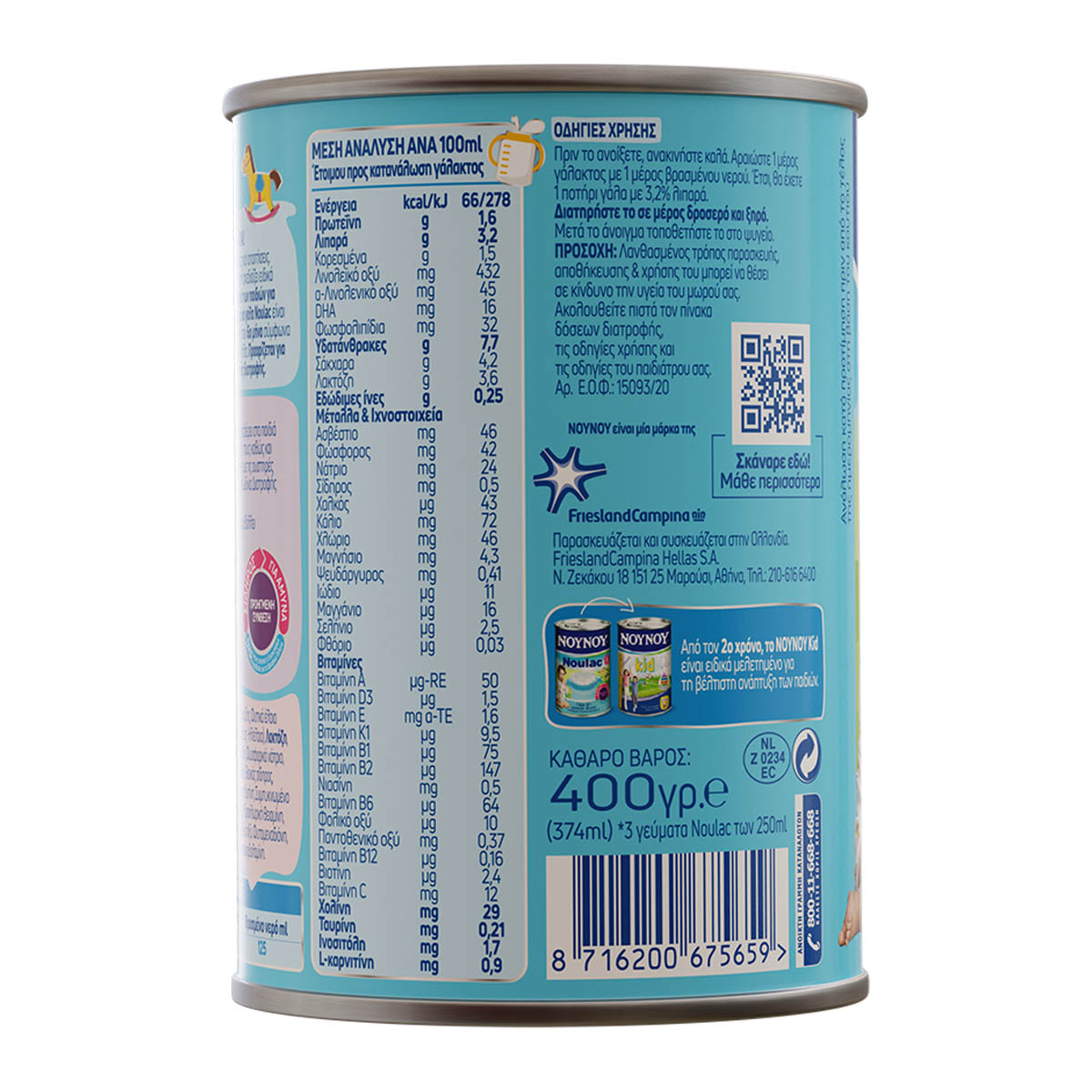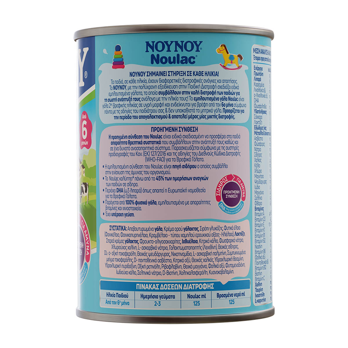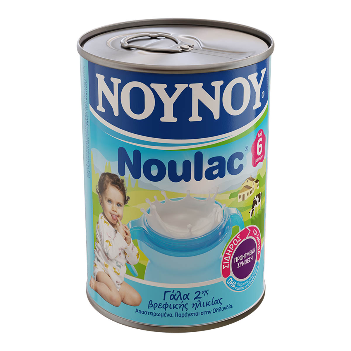 Το εμπλουτισμένο γάλα Νoulac είναι το μοναδικό γάλα 2ης βρεφικής ηλικίας σε υγρή μορφή το οποίο ενδείκνυται για βρέφη από τον 6ο μήνα σύμφωνα πάντα με τις οδηγίες του παιδιάτρου & δεν υποκαθιστά το μητρικό γάλα. Προορίζεται ειδικά για την περίοδο του απογαλακτισμού & αποτελεί μέρος μίας μικτής διατροφής. Το Noulac καλύπτει πάνω από το 45% των ημερήσιων αναγκών των παιδιών σε σίδηρο. Παράγεται από 100% φυσικό γάλα, εμπλουτισμένο με απαραίτητες βιταμίνες και ιχνοστοιχεία. Έχει υπέροχη γεύση.