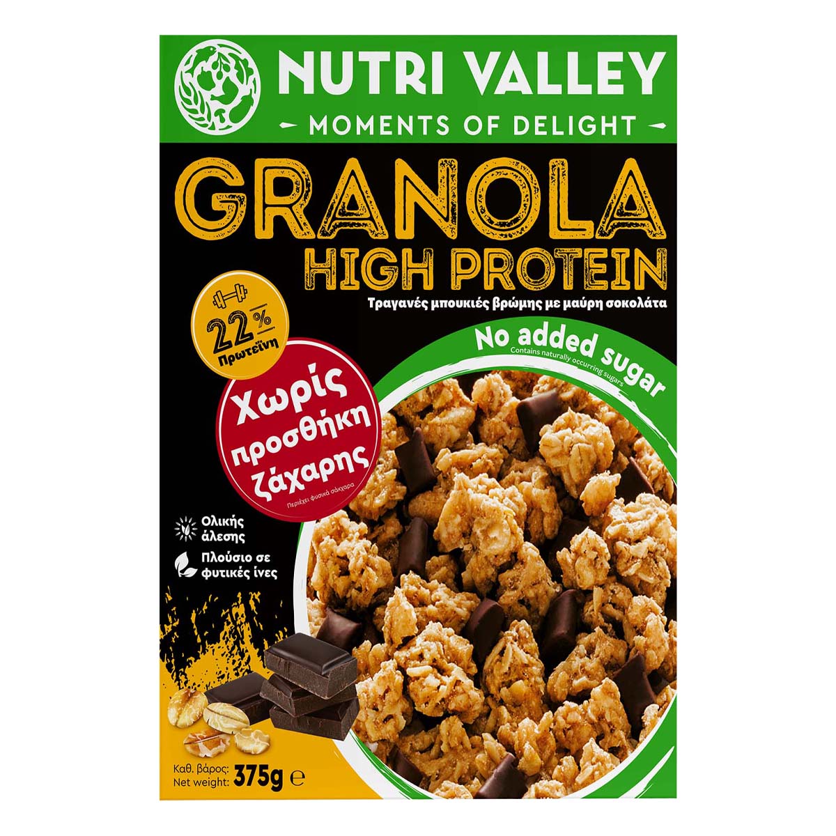 Nutri Valley Granola High Protein Τραγανές Μπουκιές Βρώμης Με Μαύρη Σοκολάτα Χωρίς Προσθήκη Ζάχαρης 375 gr