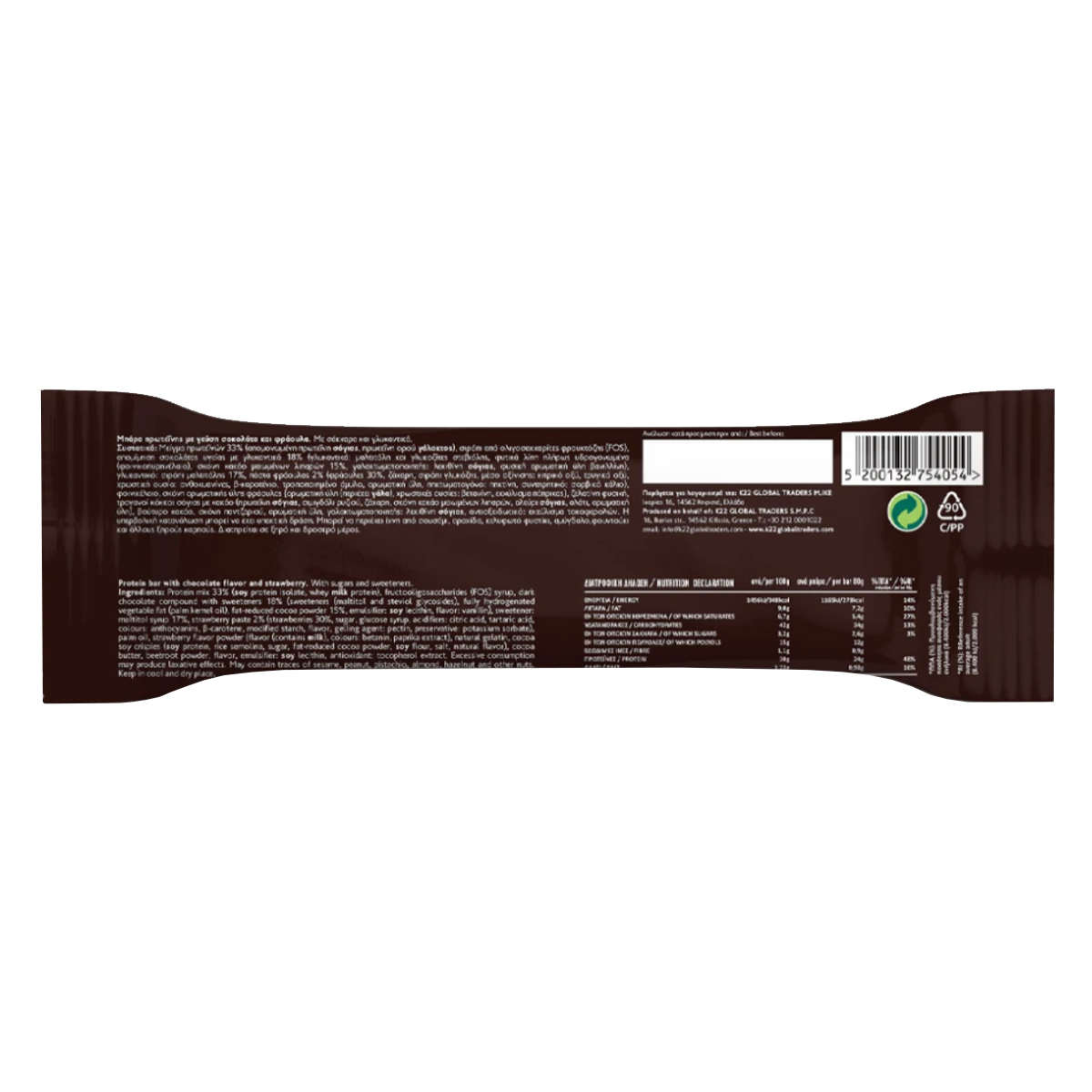 Μείγμα πρωτεϊνών 33% (απομονωμένη πρωτεΐνη ΣΟΓΙΑΣ, πρωτεΐνη ορού ΓΑΛΑΚΤΟΣ), σιρόπι από ολιγοσακχαρίτες φρουκτόζης (FOS), απομίμηση σοκολάτας υγείας με γλυκαντικά 18% (γλυκαντικά: μαλτιτόλη και γλυκοζίτες στεβιόλης, φυτικά λίπη πλήρως υδρογονωμένα (φοινικοπυρηνέλαιο), σκόνη κακάο μειωμένων λιπαρών 15%, γαλακτωματοποιητής: λεκιθίνη ΣΟΓΙΑΣ, φυσική αρωματική ύλη βανιλλίνη), γλυκαντικό: σιρόπι μαλτιτόλης 17%, πάστα φράουλας 2% (φράουλες, ζάχαρη, σιρόπι γλυκόζης, μέσο οξίνισης: κιτρικό οξύ, τρυγικό οξύ, χρωστική ουσία: ανθοκυανίνες, β-καροτένιο, τροποποιημένο άμυλο, αρωματική ύλη, πηκτωματογόνο: πηκτίνη, συντηρητικό: σορβικό κάλιο), φοινικέλαιο, σκόνη αρωματικής ύλης φράουλας, αρωματική ύλη (περιέχει γάλα), χρωστικές ουσίες: βετανίνη, εκχύλισμα πάπρικας, ζελατίνη φυσική, τραγανοί κόκκοι ΣΟΓΙΑΣ με κακάο (πρωτεΐνη ΣΟΓΙΑ, σιμιγδάλι ρυζιού, ζάχαρη, σκόνη κακάο μειωμένων λιπαρών, αλεύρι ΣΟΓΙΑΣ, αλάτι, αρωματική ύλη), βούτυρο κακάο, σκόνη παντζαριού, αρωματική ύλη, γαλακτωματοποιητής: λεκιθίνη ΣΟΓ