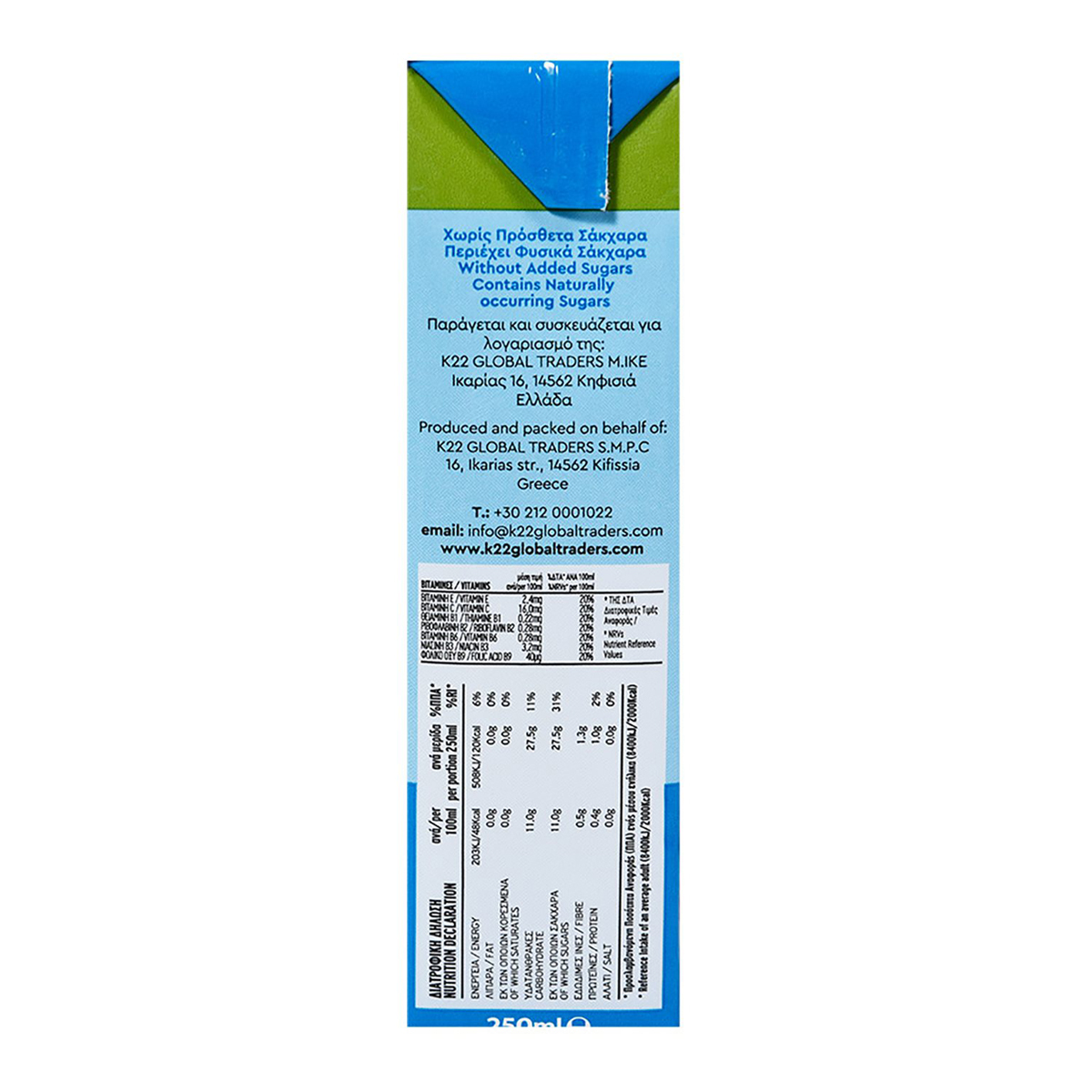 Παράγεται και συσκευάζεται για λογαριασμό της K22 GLOBAL TRADERS Μ.ΙΚΕ., Ικαρίας 16, 145 62 Κηφισιά, Αττική - Τηλ: 212 0001022, Email: info@22globaltraders.com